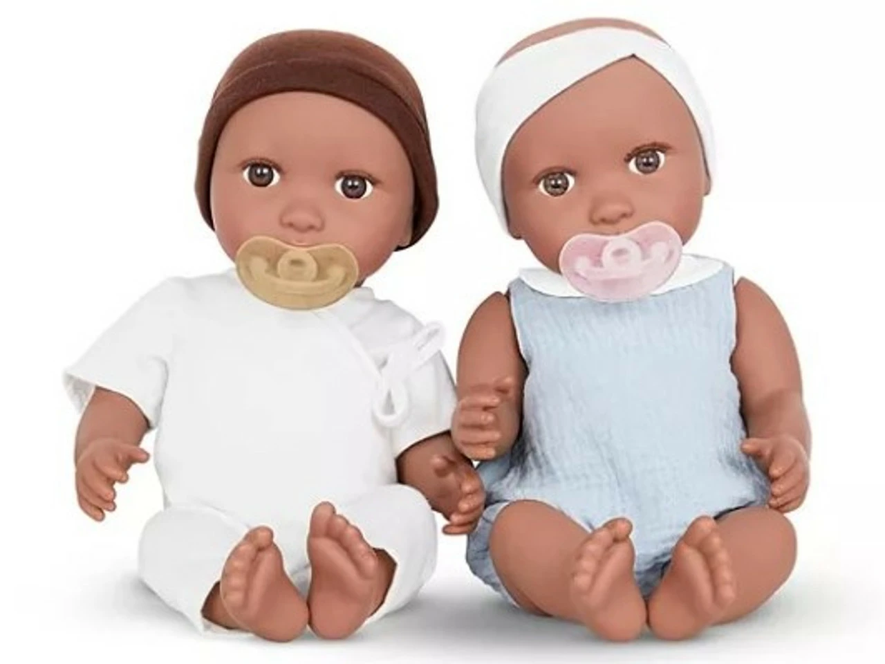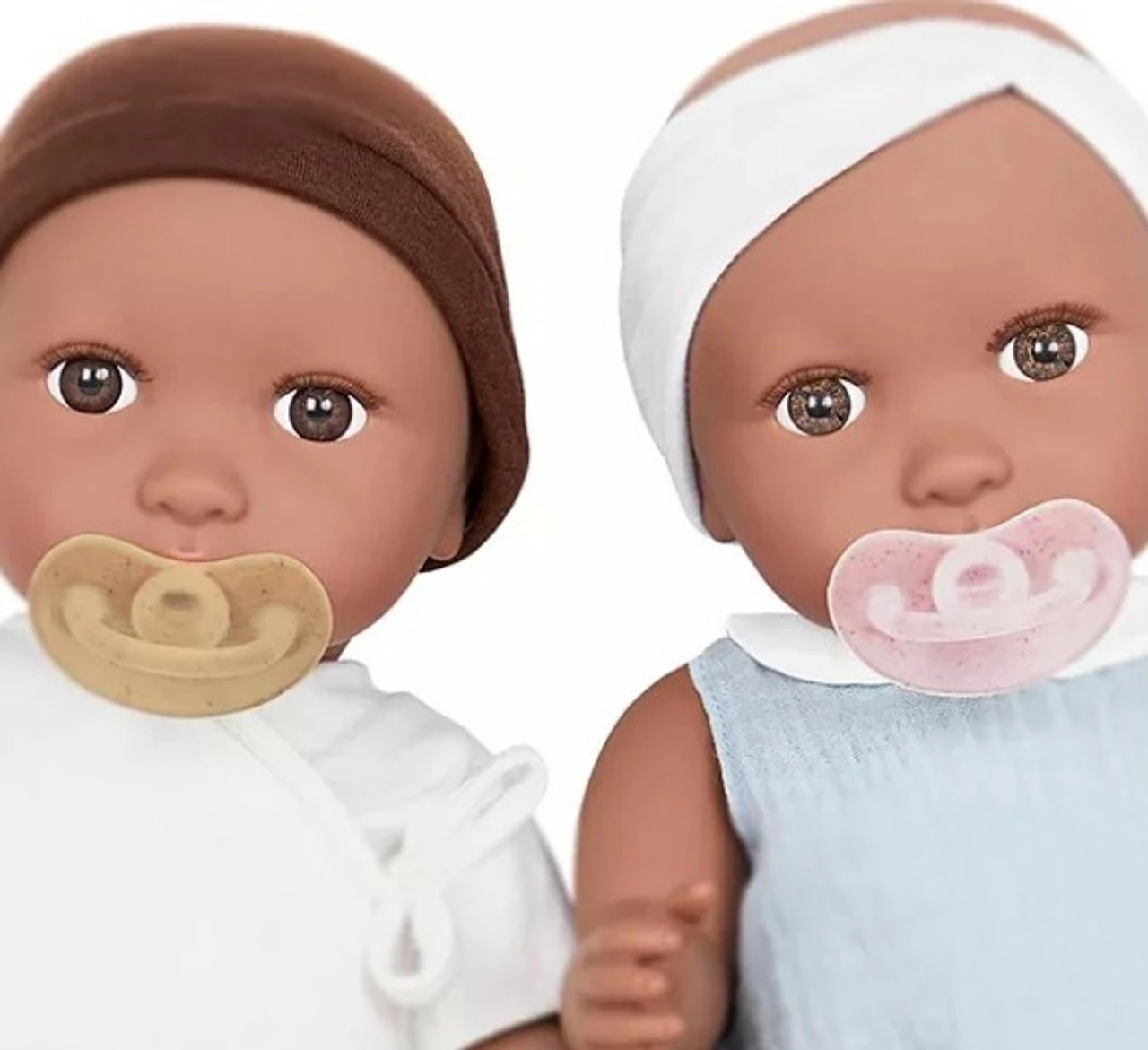 - Included: 1x 14-inch baby boy doll, 1x 14-inch baby girl doll, 2 adorable outfits, 2 removable pacifiers, 1 brown hat, and 1 white headband