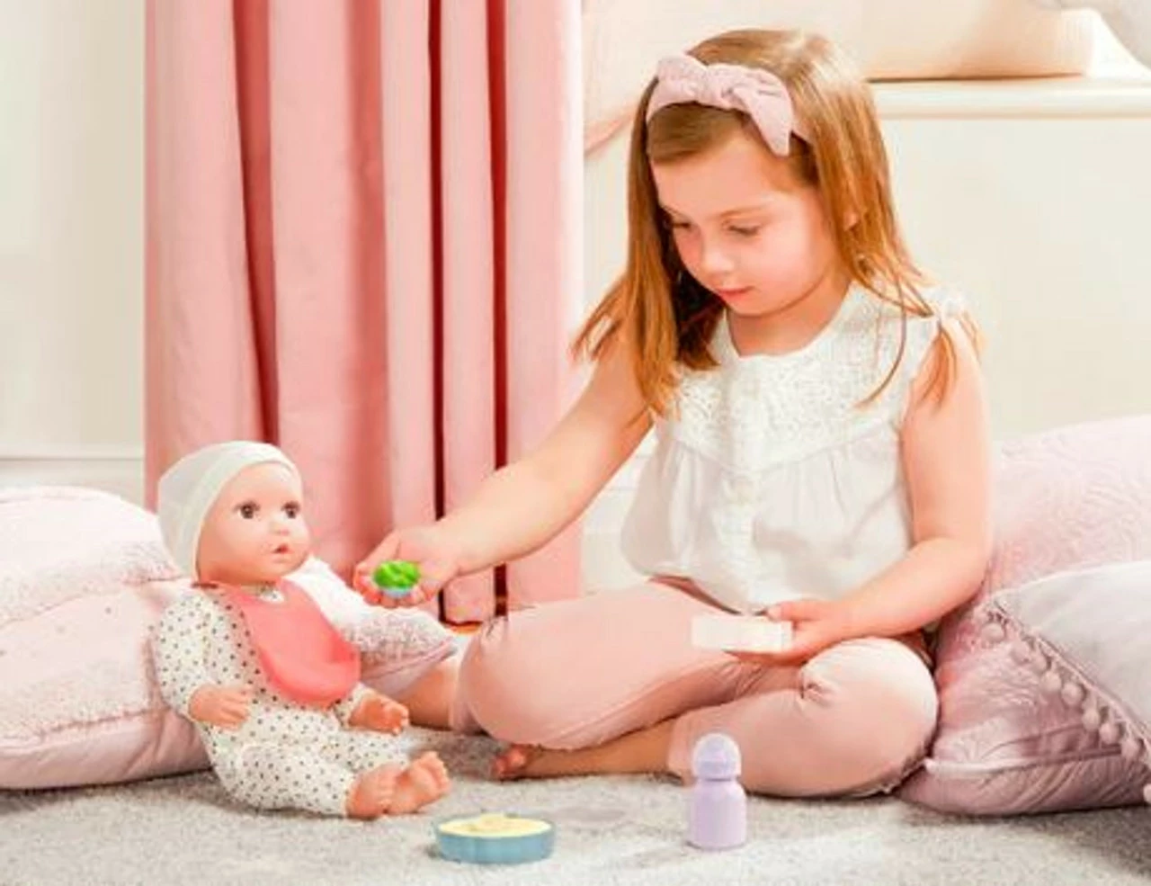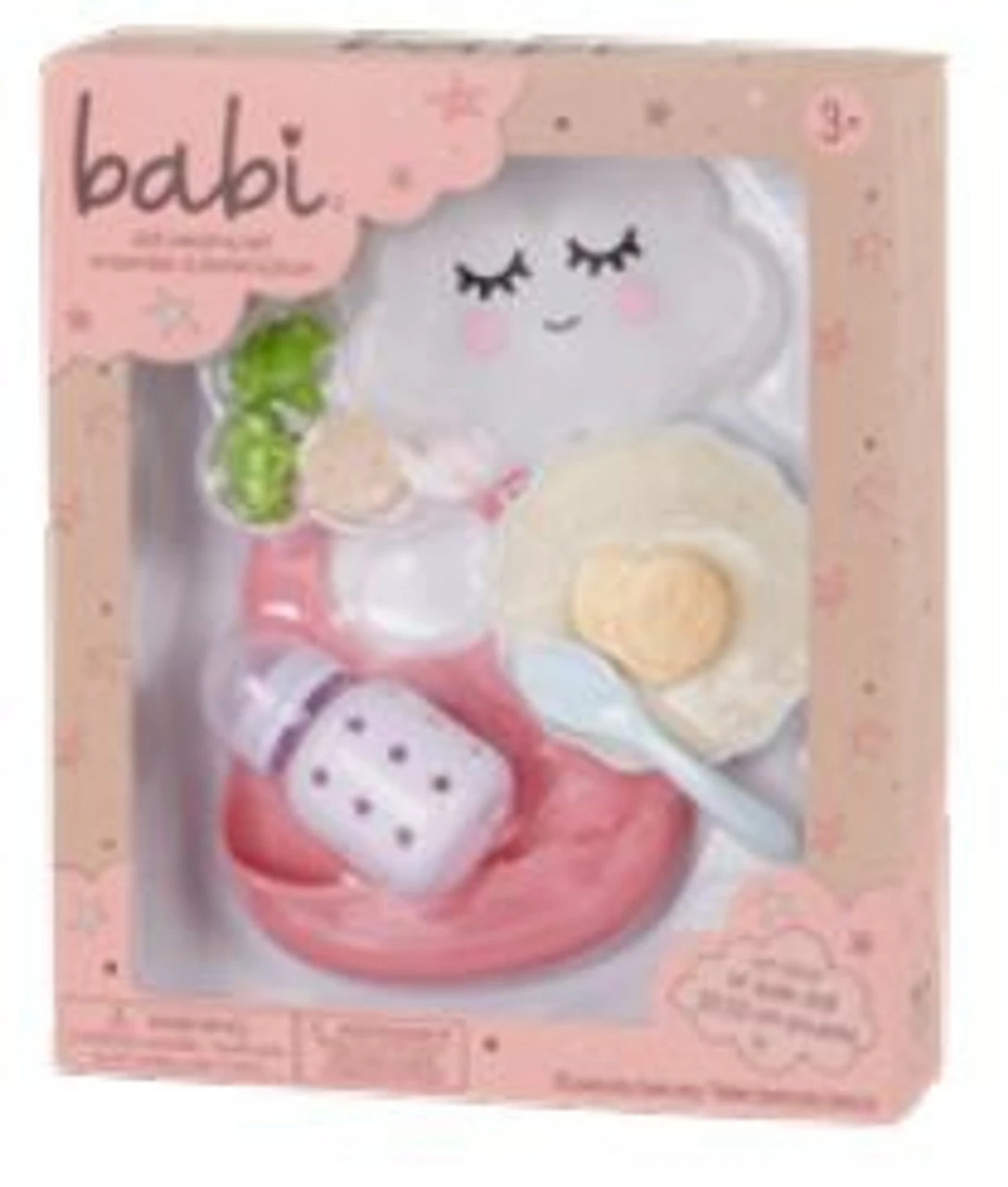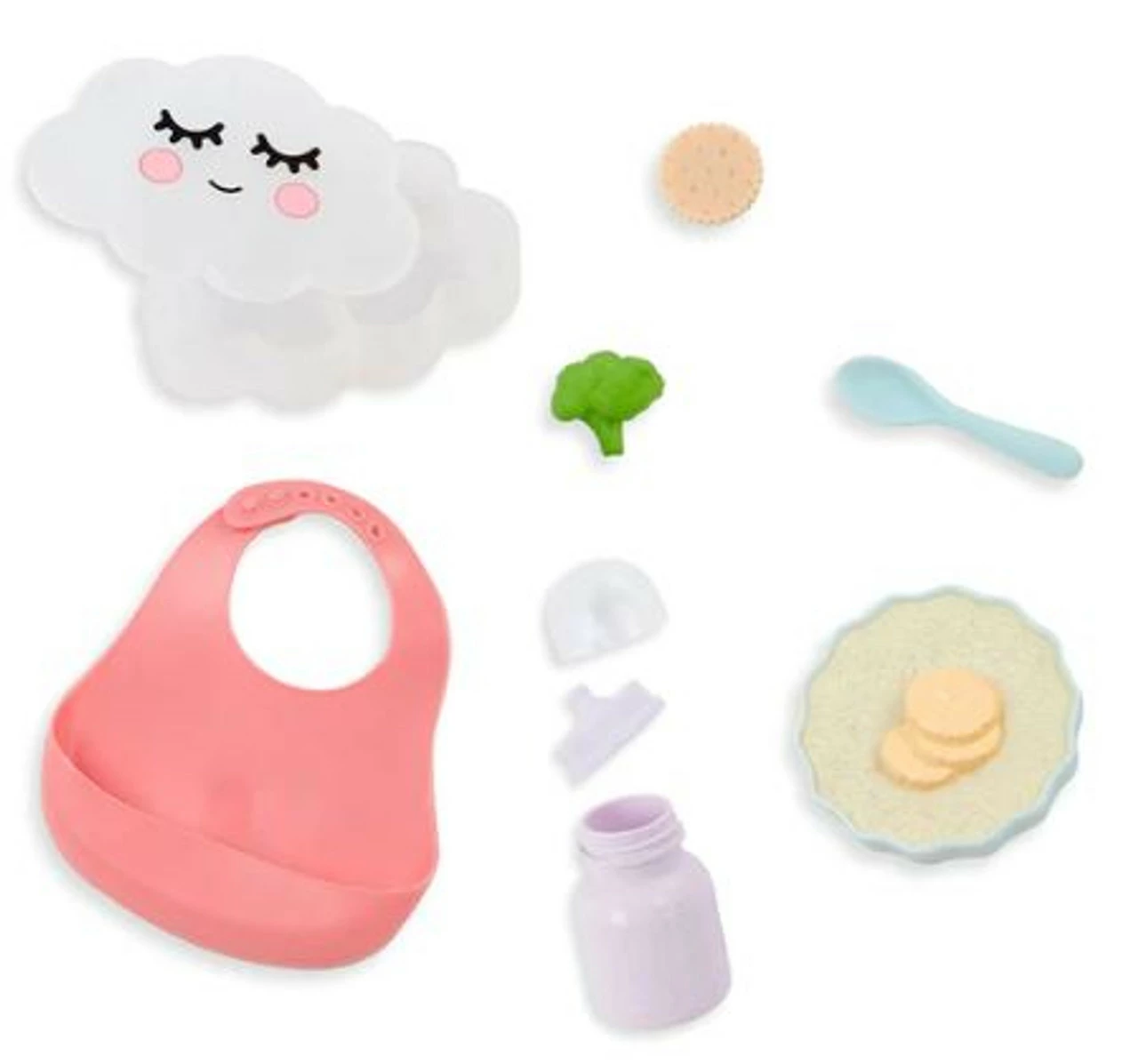 This adorable feeding set has everything kids need to keep a baby happy and fed. Set includes: 1 bib, 1 bottle with lid, 1 bowl of oatmeal with bananas, 1 snack container with lid, 2 pieces of broccoli, 2 cookies and 1 spoon.