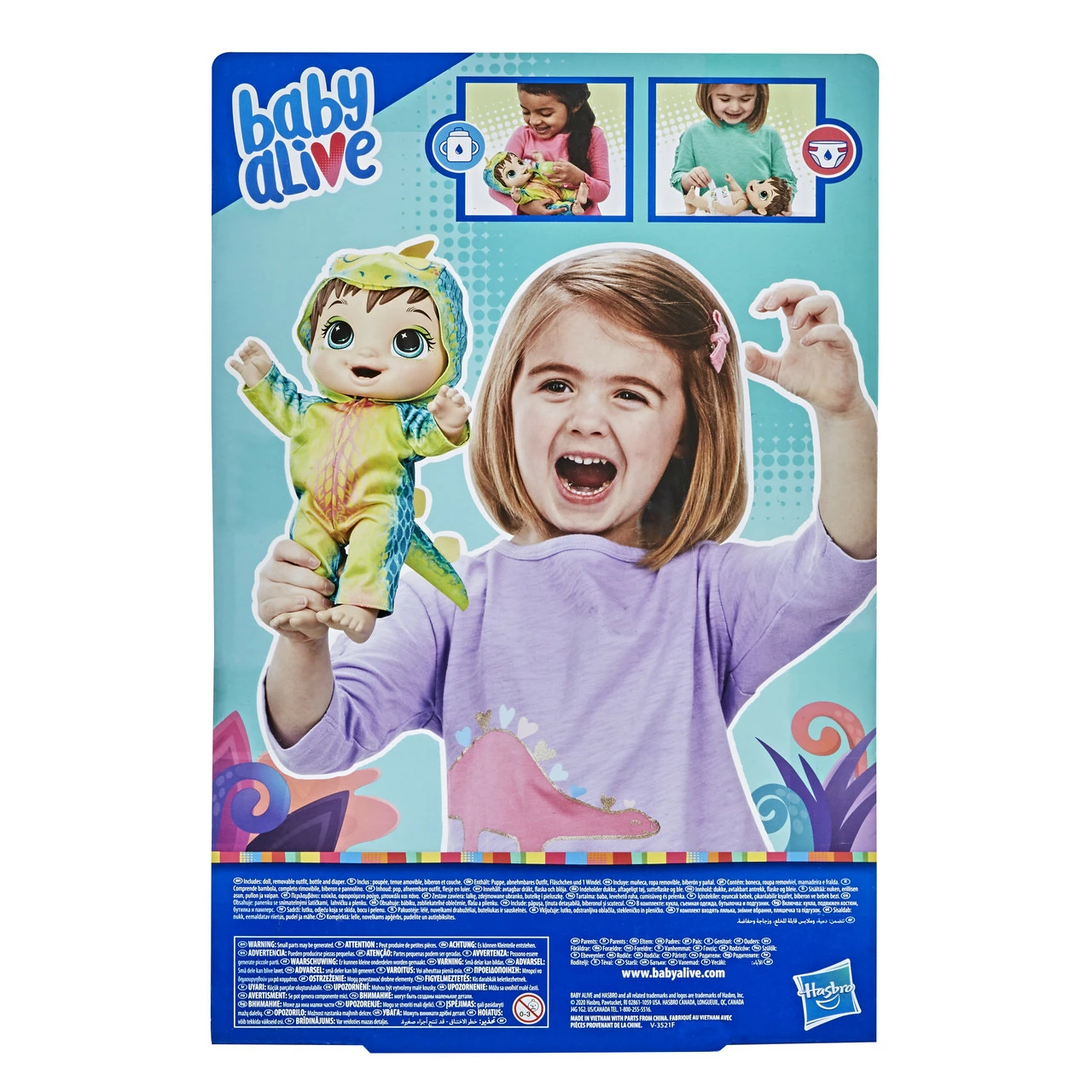 DOLL THAT DRINKS AND WETS: After she drinks, she’s going to need a diaper change! That’s because this Baby Alive Dino Cuties doll “pees” like a baby! (Additional doll diapers sold separately.)