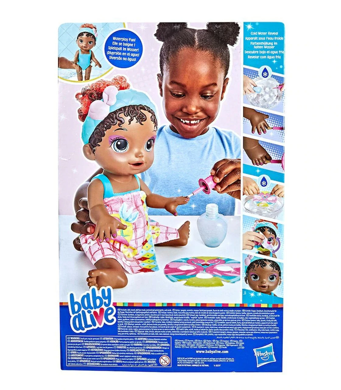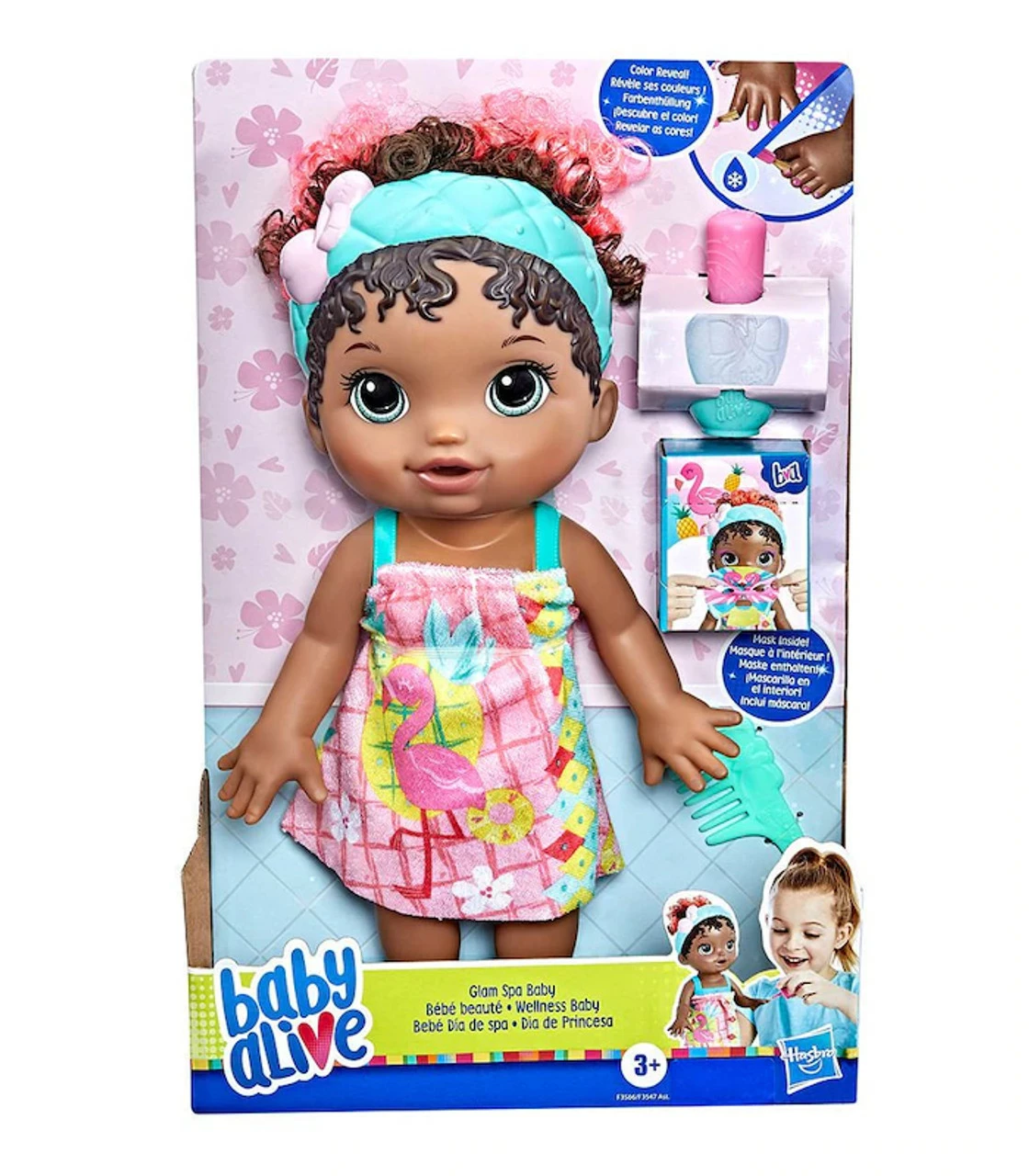 Pamper baby with spa day accessories to make her feel glamourous! With ice cold water, fill the pretend nail polish bottle and give Baby Alive Glam Spa Baby doll a color reveal mani-pedi. Then fill a bowl with ice cold water and soak dolls mask — apply to her face and remove for a gorgeous eye makeup reveal! This adorable 12.4-inch waterplay doll comes wearing an aqua molded swimsuit and attached themed headband. She also features flamingo-themed spa doll accessories, including a towel wrap, doll mask and pretend nail polish bottle. Plus, she even comes with a comb for kids to brush and style her coral color-streaked ponytail. Glam Spa Baby makes a fun makeup-themed doll for girls and boys ages 3 and up. This Baby Alive doll is also a fantastic toy for kids birthday and holiday gifts. Baby Alive and all related properties are trademarks of Hasbro.