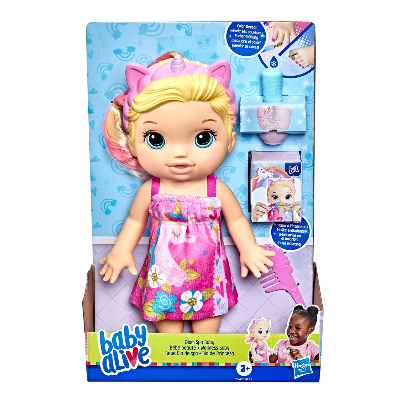Pamper baby with spa day accessories to make her feel glamourous! With ice cold water, fill the pretend nail polish bottle and give Baby Alive Glam Spa Baby doll a color reveal mani-pedi. Then fill a bowl with ice cold water and soak doll’s mask — apply to her face and remove for a gorgeous eye makeup reveal! This adorable 12.8-inch waterplay doll comes wearing a pink molded swimsuit and attached themed headband. She also features unicorn-themed spa doll accessories, including a towel wrap, doll mask and pretend nail polish bottle. Plus, she even comes with a comb for kids to brush and style her pink color-streaked ponytail! Glam Spa Baby makes a fun makeup-themed doll for girls and boys ages 3 and up. This Baby Alive doll is also a fantastic toy for kids’ birthday and holiday gifts. Baby Alive and all related properties are trademarks of Hasbro.
