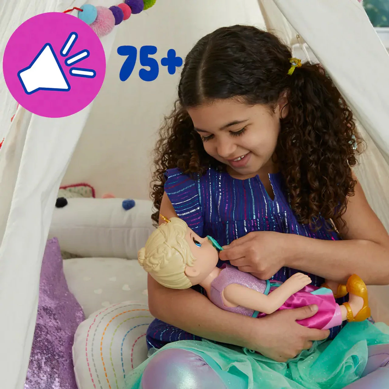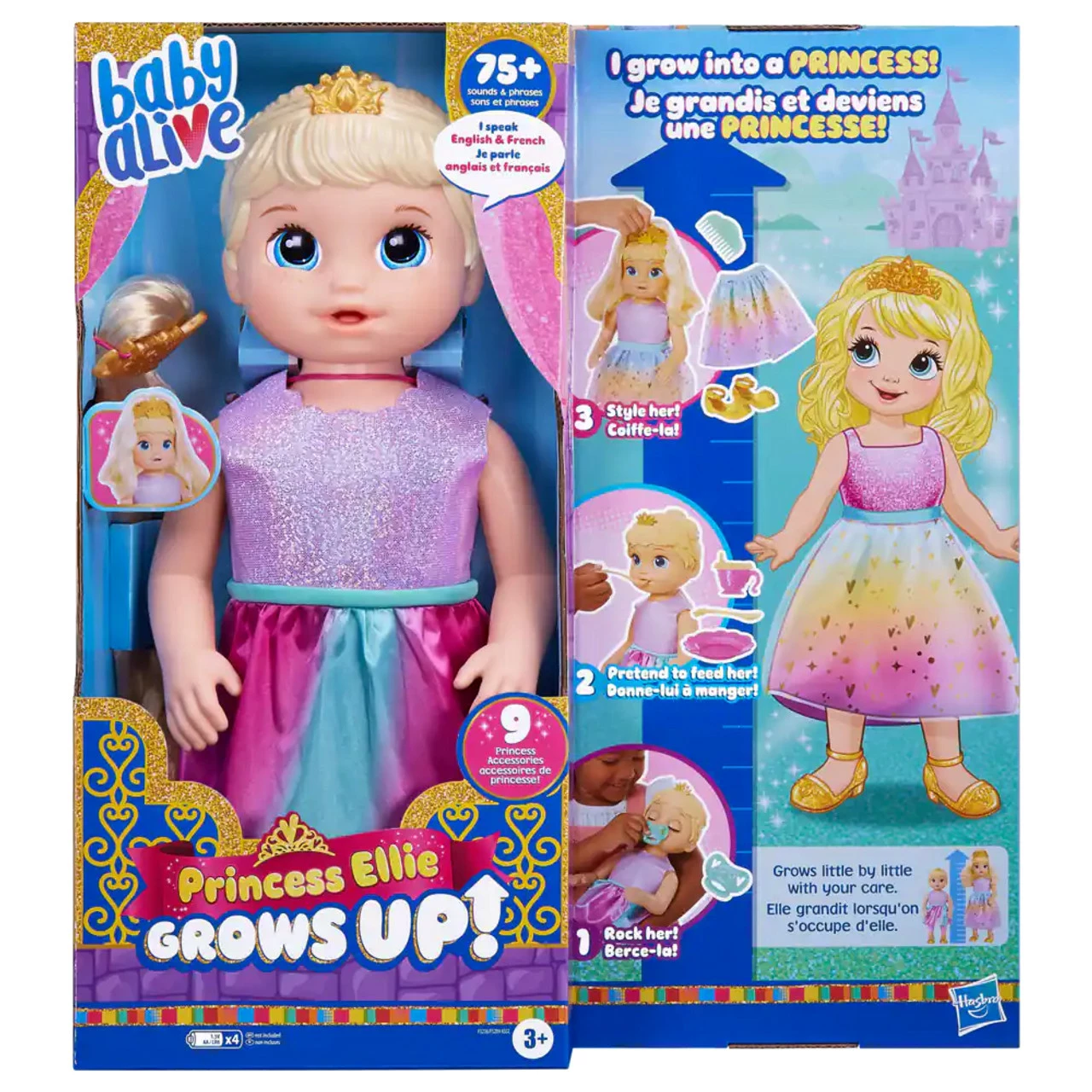 When will she grow into a gorgeous princess? Baby Alive Princess Ellie Grows Up! talking doll grows little by little with kids care and responds with 75+ sounds and phrases. A twinkly chime plays whenever she grows! As a baby, she slowly grows with rocking, giving her a pacifier and pretending to feed her with her sippy cup and bowl/spoon. Bouncing movements and pretend feeding/drinking will help her keep growing as she gets taller. Kids ages 3 and up will have fun tracking her height with the included growth chart and styling her with dress-up baby doll accessories! Place her brushable tiara hair extension on her head and put the princess skirt over her outfit to complete her royal look. Instructions and quickstart guide help kids care for their growing doll and reset her to play again! This 18-inch (45 cm) Baby Alive doll that grows up is an exciting toy for girls and boys, and a great gift for birthdays and holidays. Baby Alive and all related properties are trademarks of Hasbro.