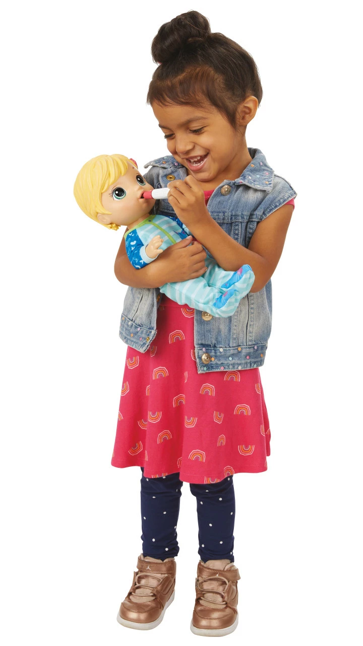 Baby Alive Mix My Medicine Baby is home sick in her kitty-cat pajamas today. Does she need her medicine? A tissue? A drink of water? Find out what’s wrong by using her special interactive thermometer. Once you know what’s wrong with baby, you can choose 1 of the 2 medicine packets to make her all better. Mix the powdered doll medicine with 3 tsp. (15 ml.) of water, then use the medicine dropper to give baby her medicine! And oh, dear… does baby have a boo-boo? Use the bandage sticker to soothe baby — and a cuddle and kiss helps, too! Kids will have fun mixing up medicine for baby, changing baby’s diaper (additional diapers sold separately), and making their baby doll feel all better.