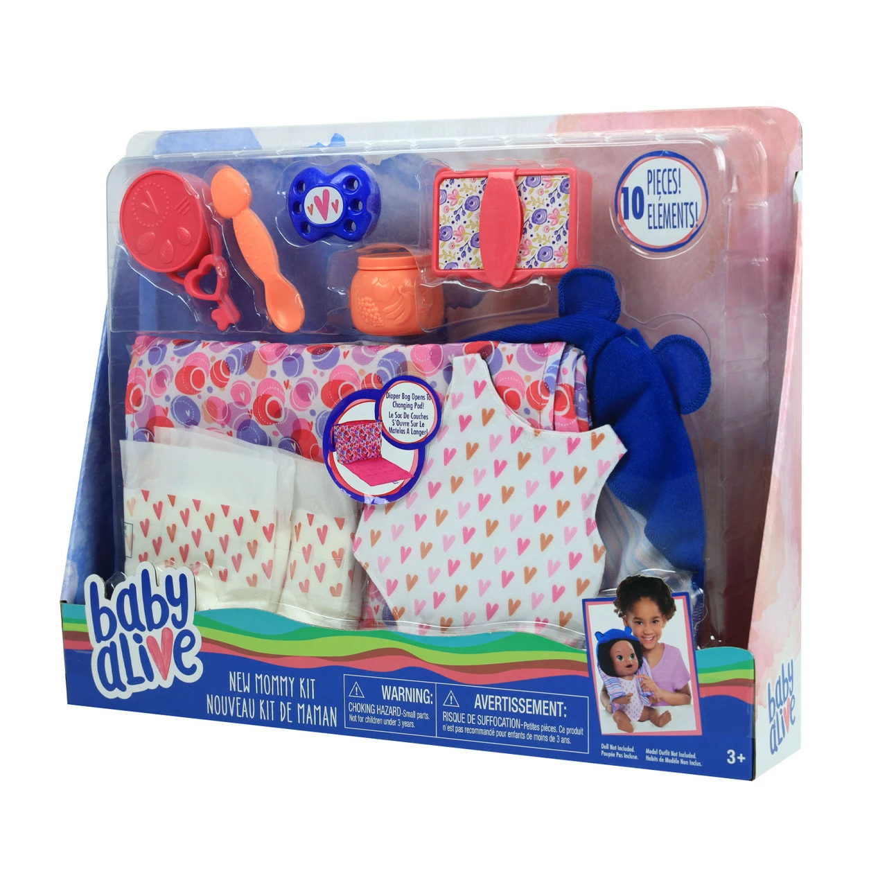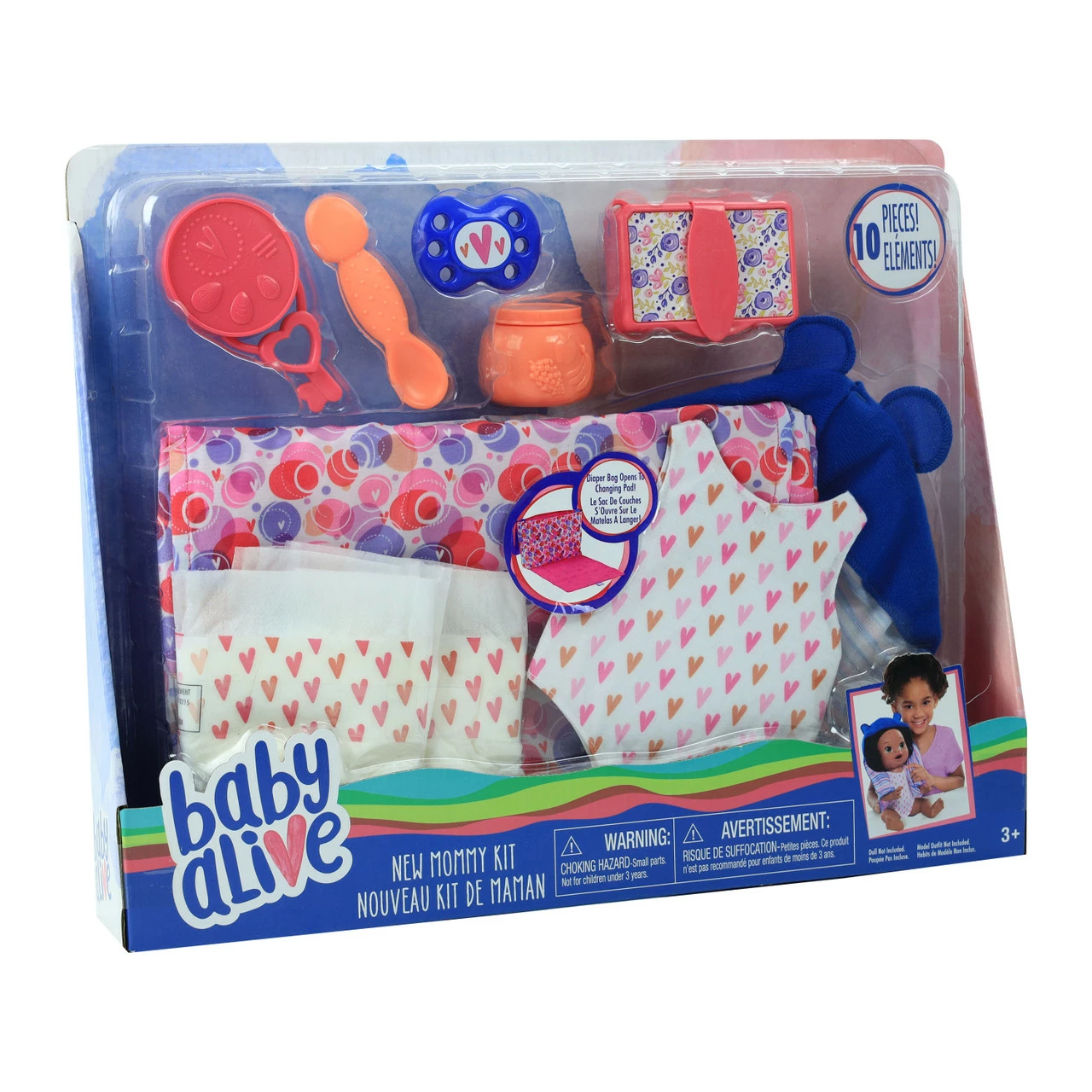 Now your little ones can pretend to be a real mommy with the Baby Alive New Mommy Kit. This adorable kit features a portable and stylish diaper bag which transforms into a changing pad for when baby needs a diaper change on the go! The bag features two-sided carrying straps for easy transport and can hold all nine mommy-essential accessories including: two diapers, one snack jar, one baby spoon, one pack of play baby wipes with wipes, a onesie, one swaddle blanket, one pacifier, and one play key ring for when baby is teething! Use the cute onesie, baby wipes, and diapers to change your baby when things get messy! Don’t forget to wrap her up in the colourful swaddle blanket and give her the pacifier when she cries! Your little one will always be prepared to take care of her baby doll with the Baby Alive New Mommy Kit.