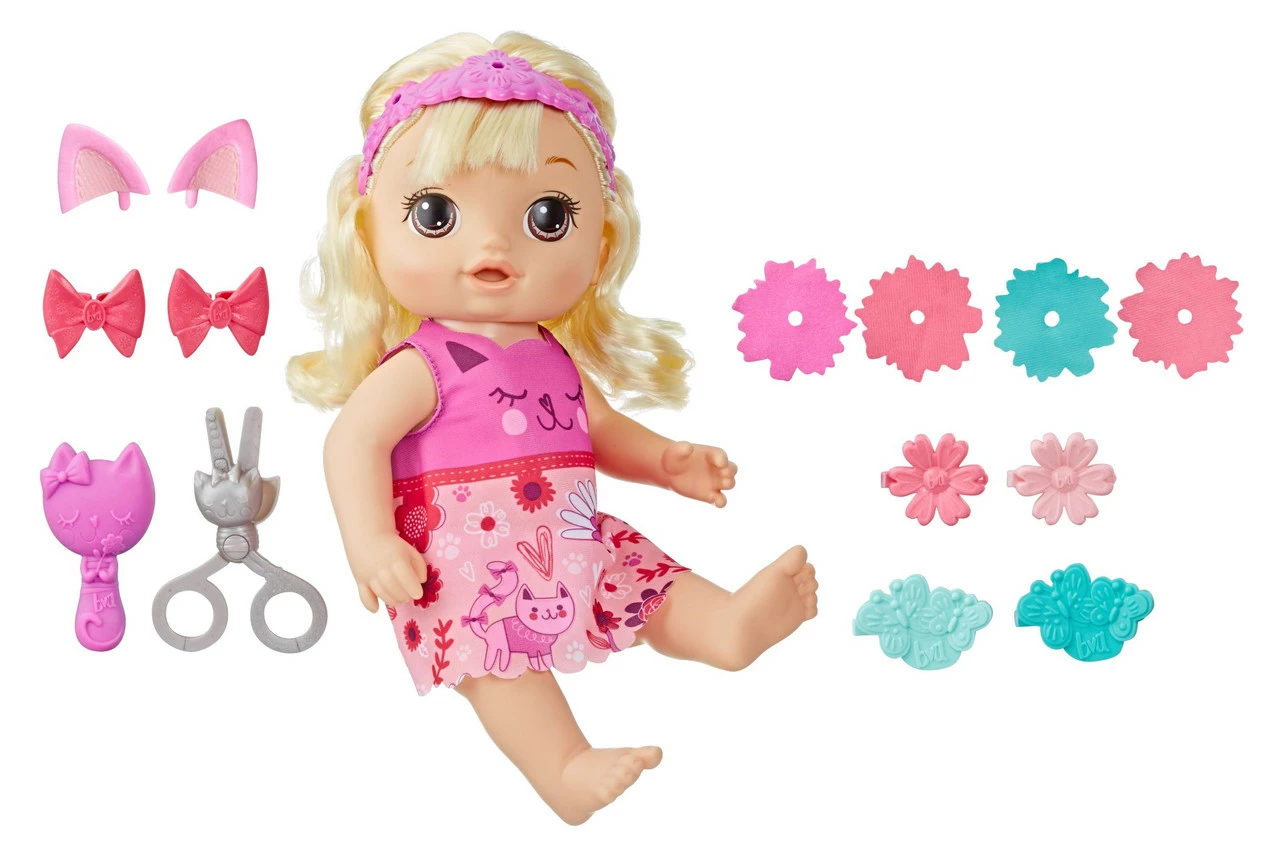 “Let’s try a new hairdo!” Baby Alive Snip ‘n Style Baby doll is ready for you to brush, trim, and style her hair! When you brush baby’s bangs with her interactive brush, they grow! Uh-oh, baby, your hair is getting so long… you need a haircut! “Snip, snip!” Hold the included interactive scissors up to baby’s bangs and pretend to trim them, and they’ll get shorter! Once you’ve brushed baby’s hair and given her a trim, use the included kitty ears, hairclips, fabric flowers, and hair bows to style her hair all different ways! With 35+ sounds and phrases in English and Spanish, 12 hair accessories, an interactive brush and scissors, and bangs that really grow — Baby Alive Snip ‘n Style Baby is a sweet baby doll and a great gift idea for boys and girls ages 3 years old and up.