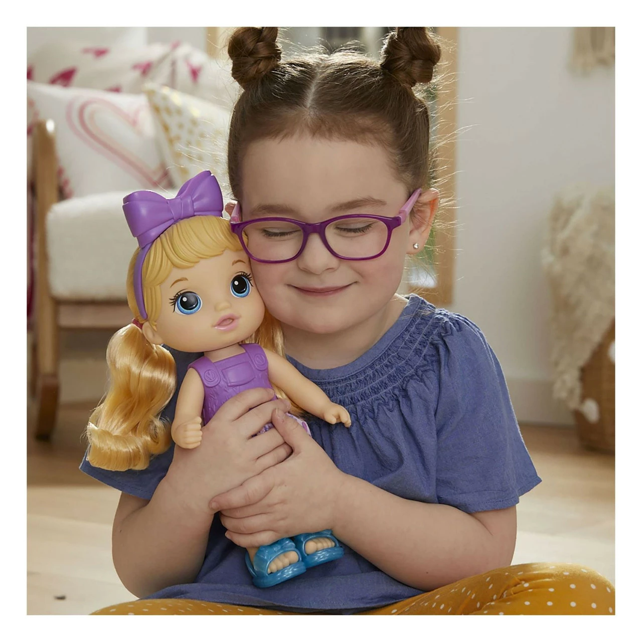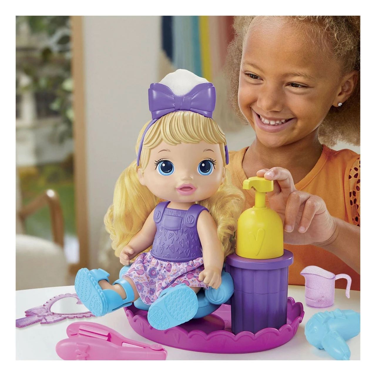 Its a bubbly salon with Baby Alive Sudsy Styling doll! Little aspiring hair stylists can place their baby doll in her styling chair and pretend shes at a sudsy salon. This Baby Alive doll features a salon doll chair with base, plus a cup to mix her bubble solution. She also includes pretend salon doll accessories like a comb, styling tool, pretend blow dryer, mirror and barrette. Kids ages 3 and up can pour the bubble solution into the chair, press the button on the chairs arm and watch bubbles form on her head! Use her doll hair accessories to shape the suds and style her brushable hair — then show off her look in her mirror! When the bubble solution is done, use your own childrens shampoo or clear bubble solution to keep the sudsy fun going. Sudsy Styling doll is a great pretend hair salon toy set for girls and boys, and she makes a fantastic gift for birthdays and holidays. Baby Alive and all related properties are trademarks of Hasbro.