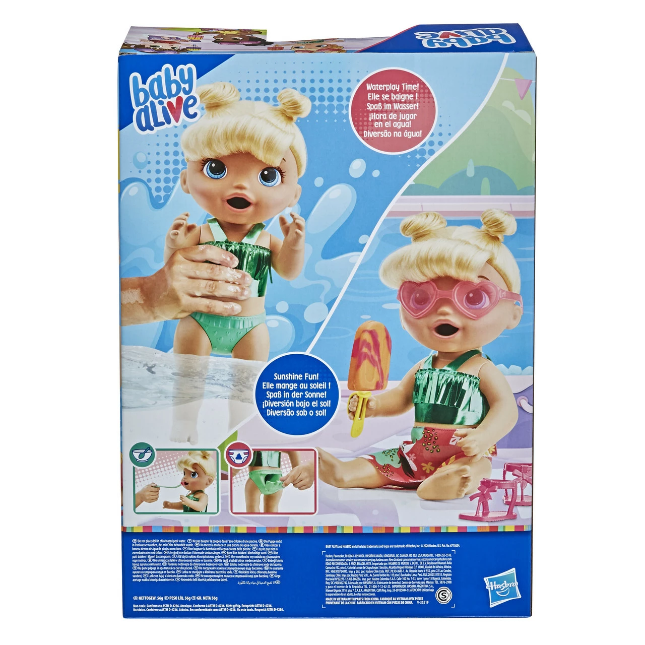 PLAY IN AND OUT OF THE WATER: It’s the first Baby Alive doll to feature both feeding and waterplay! Remove all solid doll food, then Sunshine Snacks doll is ready for a dip!