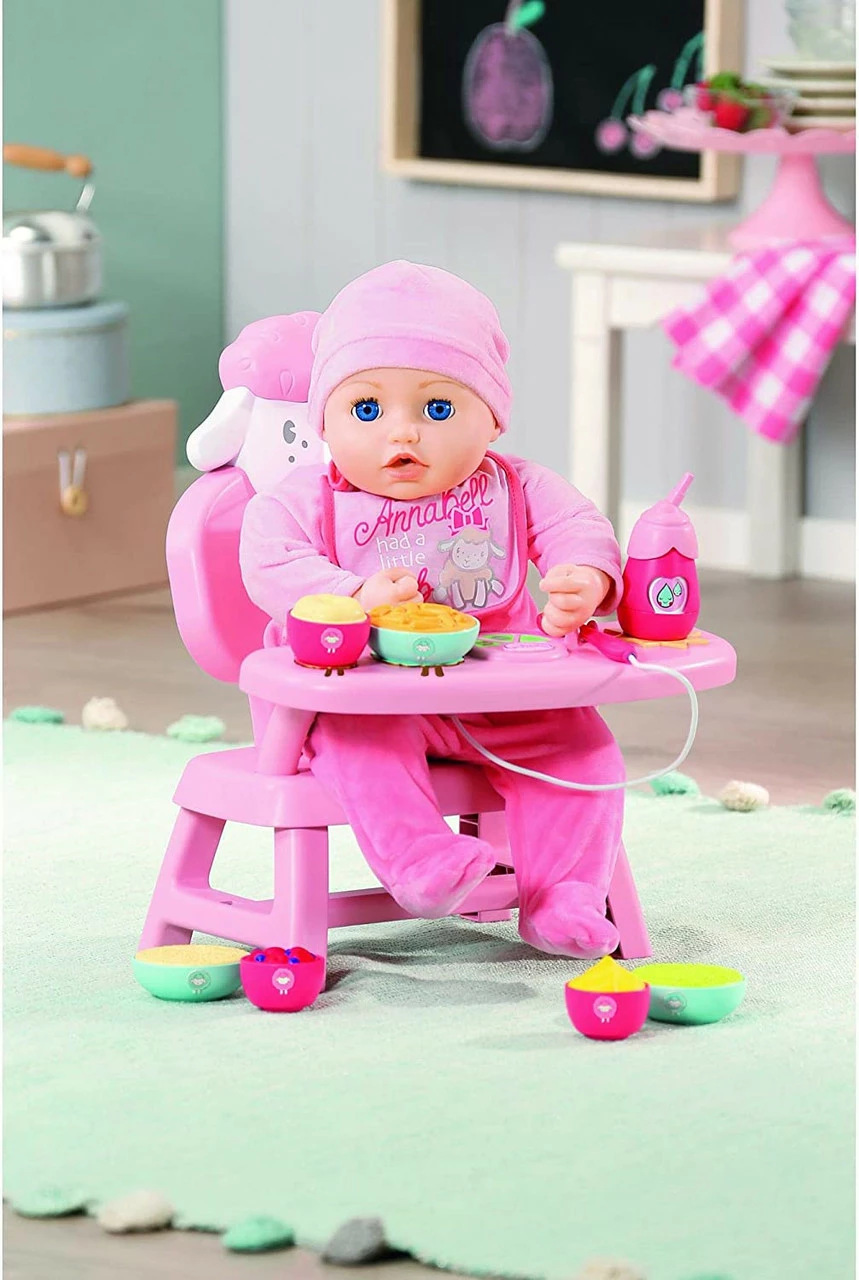 What’s on the menu for Baby Annabell’s lunch? Does she want peas or carrots? Is it berries or custard for pudding? What drink does she want? Sit her in the chair and see her reaction.