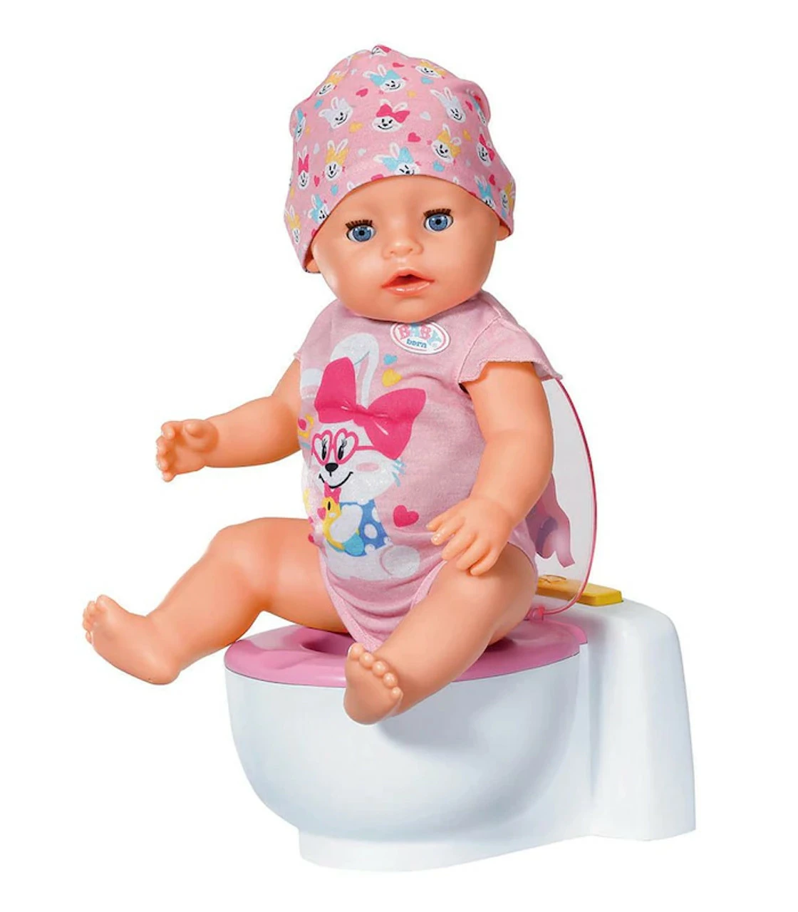 “BABY born is a big girl already. She goes to the toilet so confidently. As soon as she sits on her white throne with its pink seat, wee wee sounds, applause and BABY born’s happy laughter can be heard. The little one even does a number two. A colourful, glittery poo appears in the bowl. Quick, time to flush. When the flush button is pressed, the poo disappears and flushing sounds are heard.