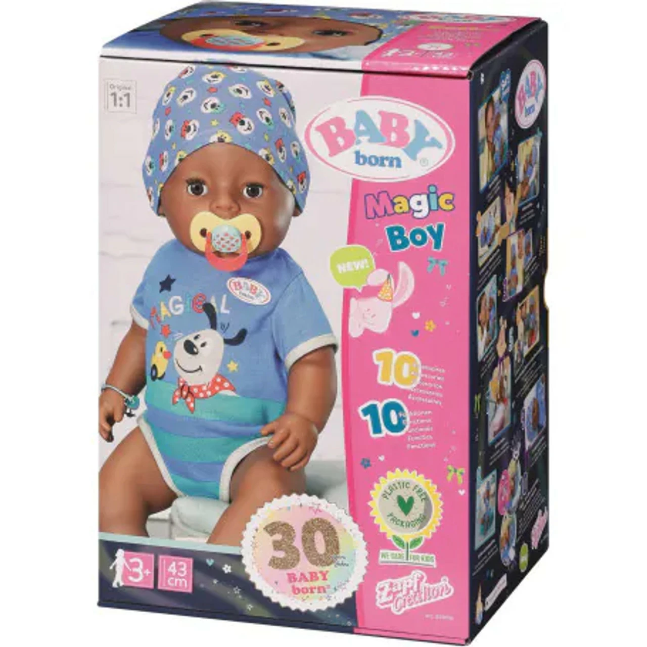 BABY born Magic Boy 43cm with bodysuit and hat. Includes 1 potty, 1 nappy, 1 plate with spoon, 1 portion of porridge, 1 bottle, 1 magic dummy, 1 birth certificate and 1 friendship bracelet each for the child and doll.”