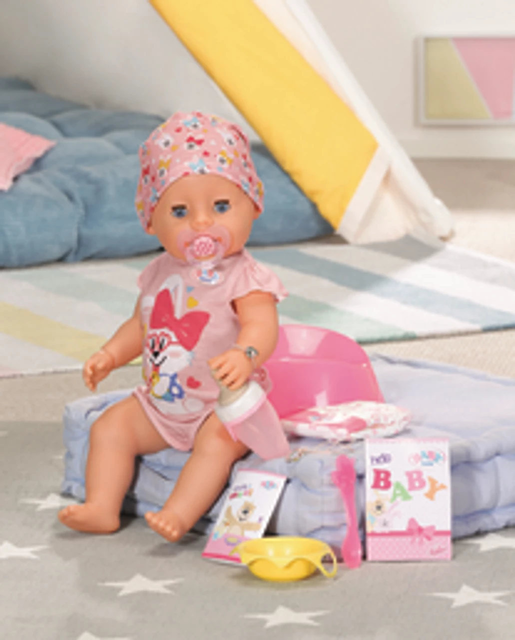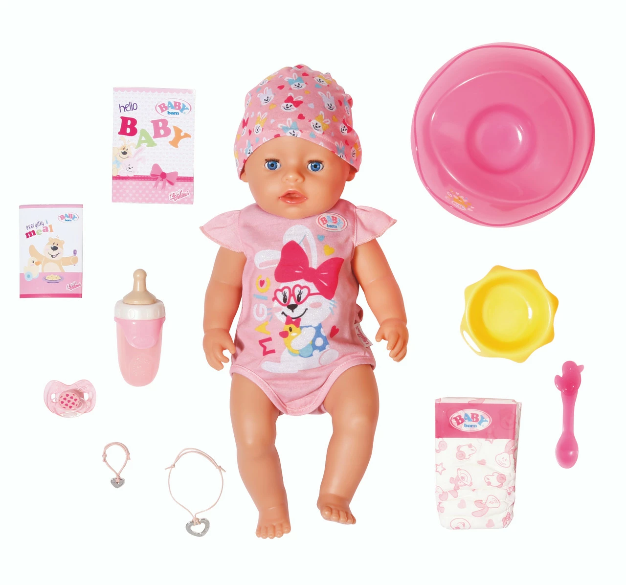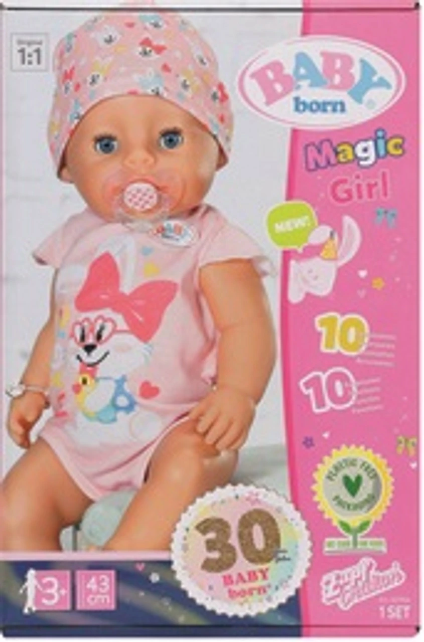 BABY born Magic Girl 43 cm with bodysuit and hat. Includes 1 potty, 1 nappy, 1 plate with spoon, 1 portion of porridge, 1 bottle, 1 magic dummy, 1 birth certificate and 1 friendship bracelet each for the child and doll.