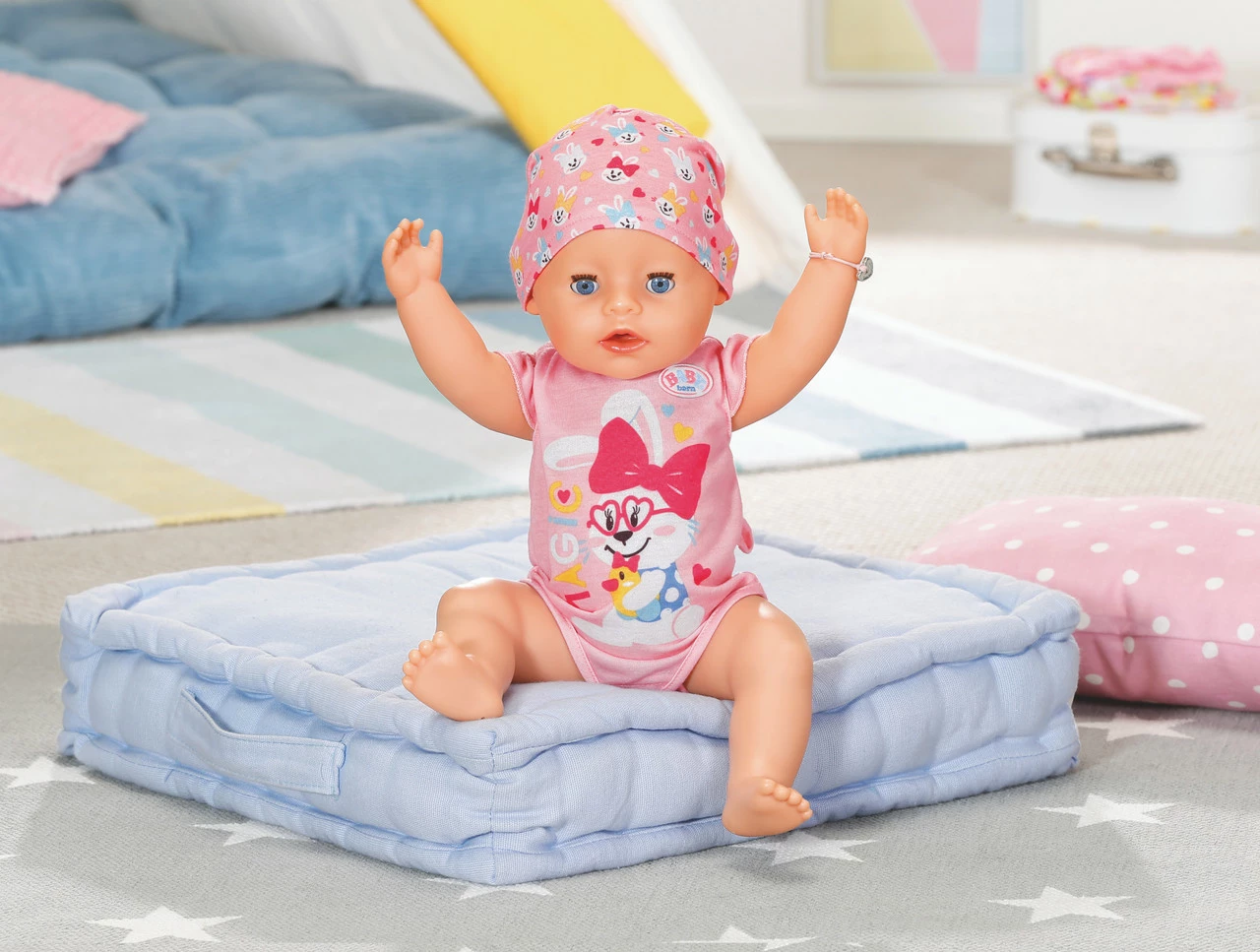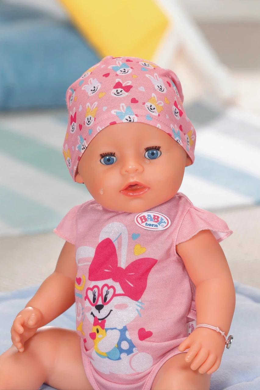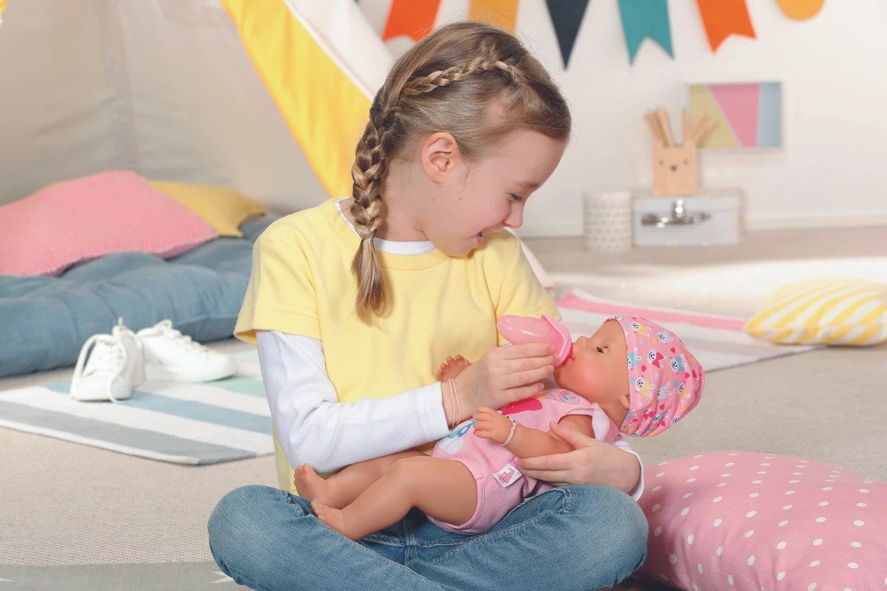 BABY born Magic Girl 43 cm with bodysuit and hat. Includes 1 potty, 1 nappy, 1 plate with spoon, 1 portion of porridge, 1 bottle, 1 magic dummy, 1 birth certificate and 1 friendship bracelet each for the child and doll.