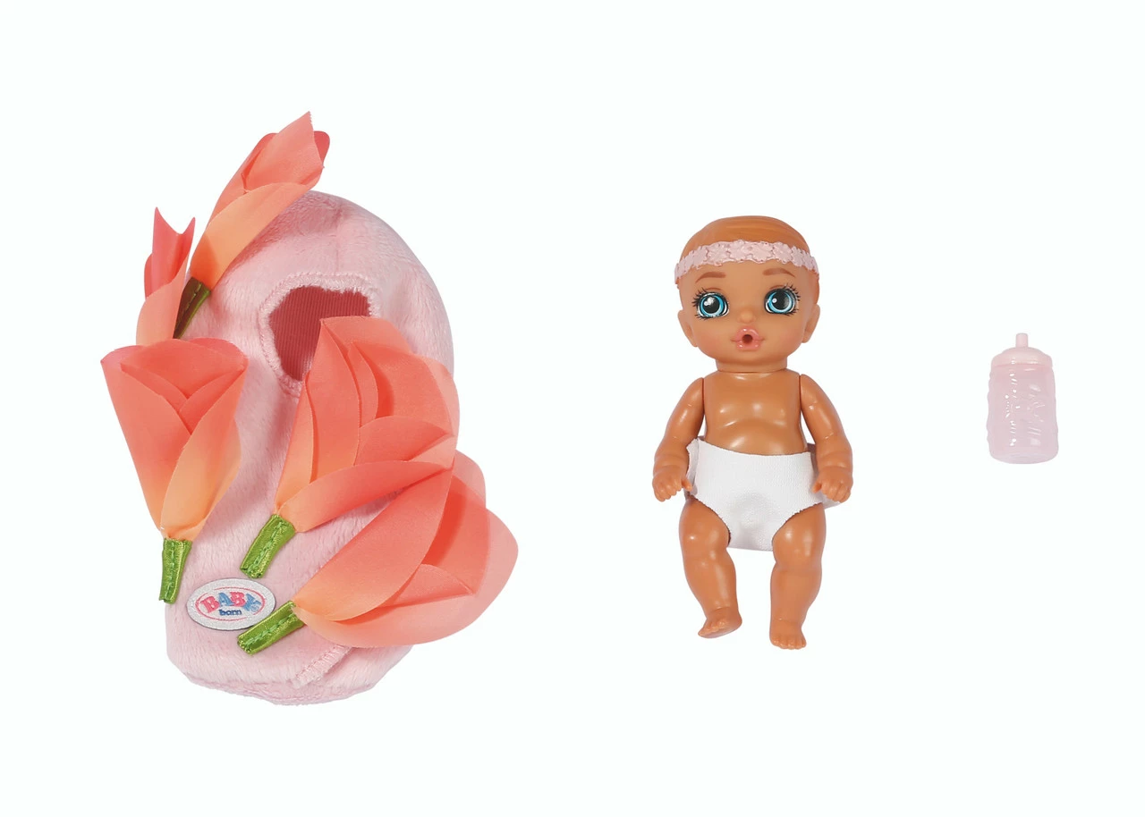 BABY born Surprise 4 Garden including swaddle wrap, nappy, bottle, birth certificate and overview of the Babies. PDQ with 12 different designs in 12 surprise packs.” Unwrap Baby born® Surprise, the cutest little bundle of joy! Discover all new babies, swaddles, and colour change diapers in the all new flower packaging! Untie the bow and remove the outer flower case to reveal a sparkly, pink pouch. Reach in to uncover which baby you got. Each baby is bundled up in an adorable soft, snuggly swaddle, sewn in a surprise design theme such as a beautiful flower or a cute genie. Use water to wake baby up and reveal baby’s eye colour. Unwrap the swaddle to uncover baby’s unique hairstyle. Baby’s bottle colour tells if it’s a boy or a girl. Feed baby water and they pee to reveal the colour change diaper pattern. Baby’s arms and legs move, so they can sit up or lay down. There are so many adorable babies, cute swaddles, and colour change diapers to collect! Includes a collector’s guide with surprise games to help find baby’s name, birthday, and favourite food. Also includes a birth certificate to fill out.