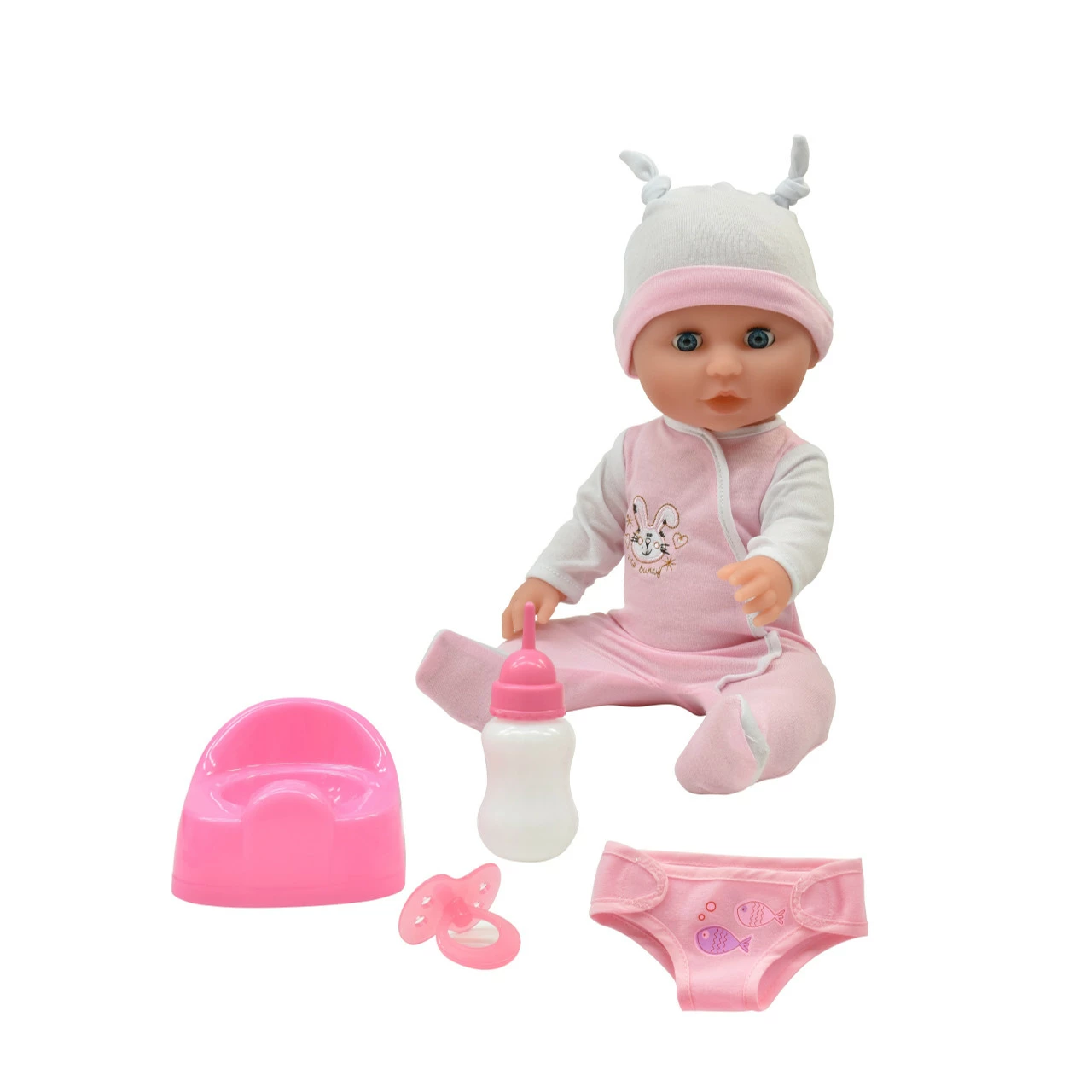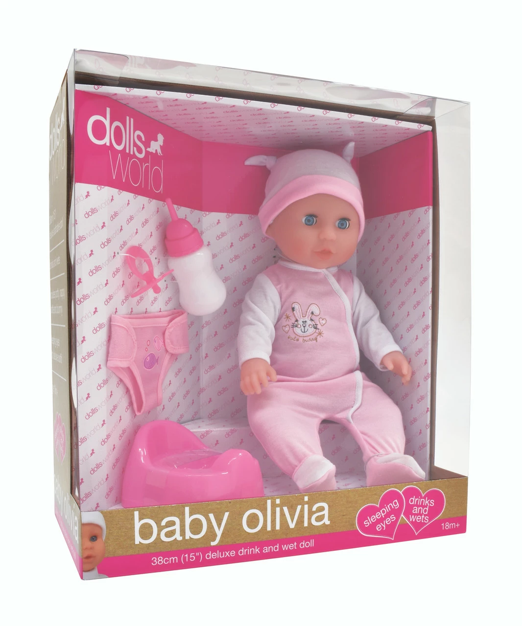 38cm (15″) deluxe all vinyl drink and wet doll. Olivia has a very cute face, removable detailed outfit and hat, set includes potty, bottle, dummy and fabric nappy.