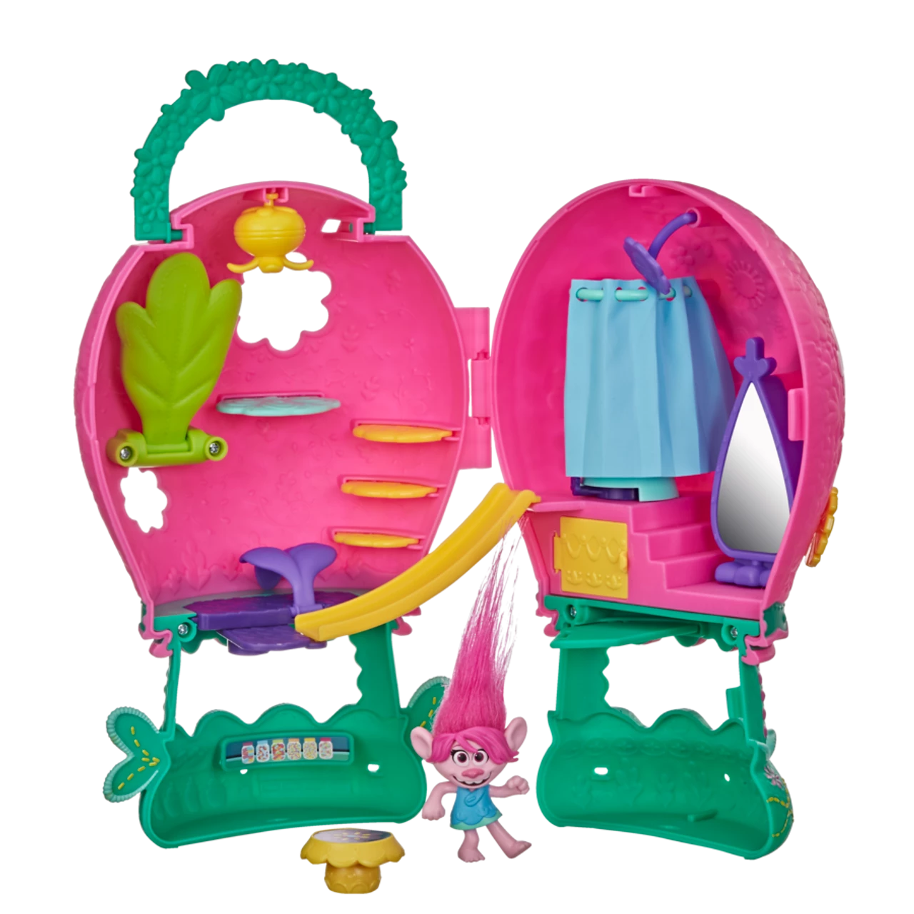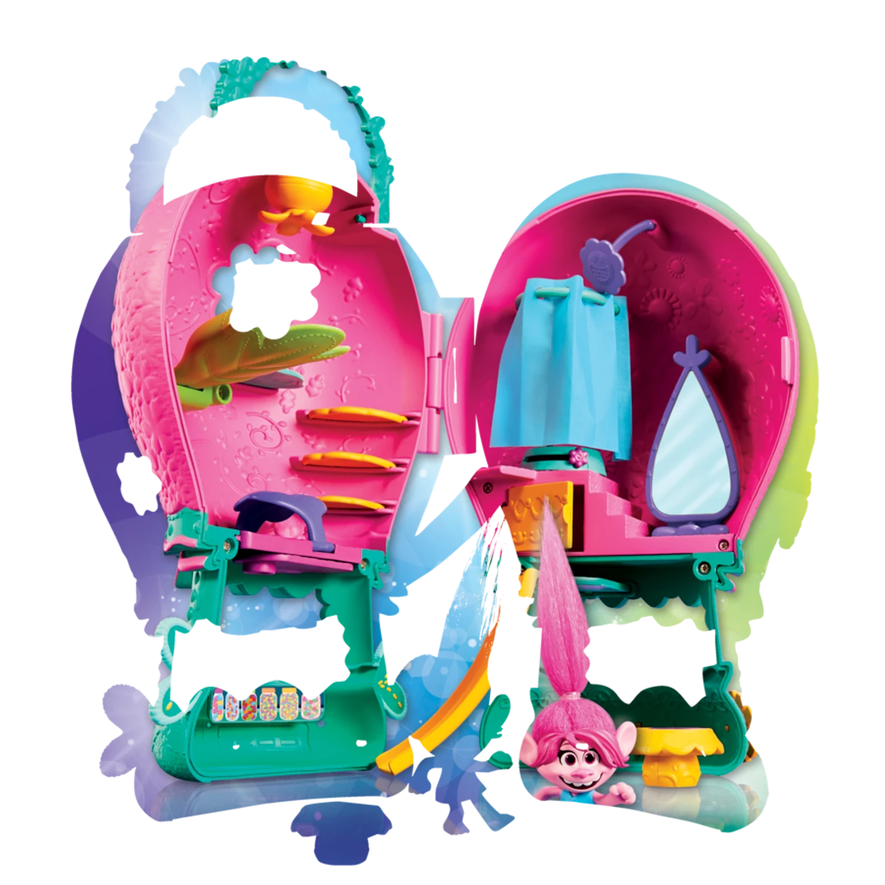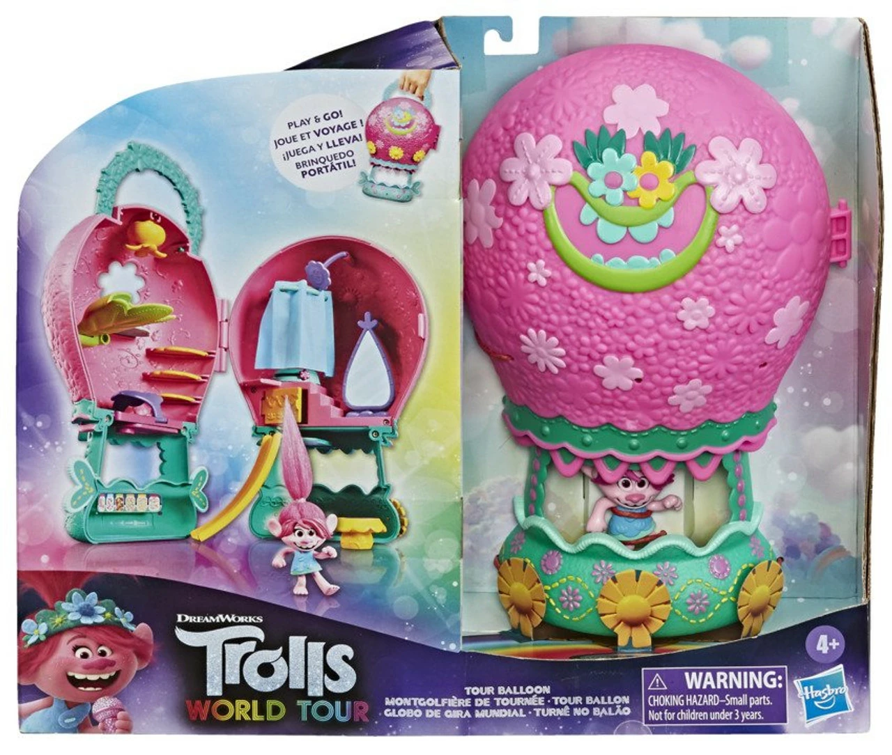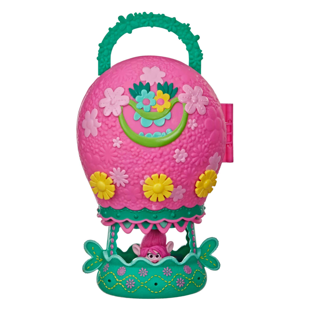 When DreamWorks Poppy sets out on her adventure, she travels in style in her butterfly-powered balloon. Now kids can take their Trolls dolls on an awesome adventure with the DreamWorks Trolls World Tour Tour Balloon. This playset opens up to reveal everything Poppy needs to travel on her adventure, including a bed that folds down, a shower with shower curtain, a slide that can be attached to different places, and 3 flowers that can also be moved to different places so kids can customize their toy. And when they’re done playing, they can store the included Poppy figure and other DreamWorks Trolls dolls like Branch, DreamWorks Trolls Cooper, Biggie, Cloud Guy, Guy Diamond and others inside, then use the handle on top to take it along for on-the-go play. (Additional figures sold separately. Subject to availability.) DreamWorks Trolls Copyright 2020 DreamWorks Animation LLC. All rights reserved. Hasbro and all related terms are trademarks of Hasbro.