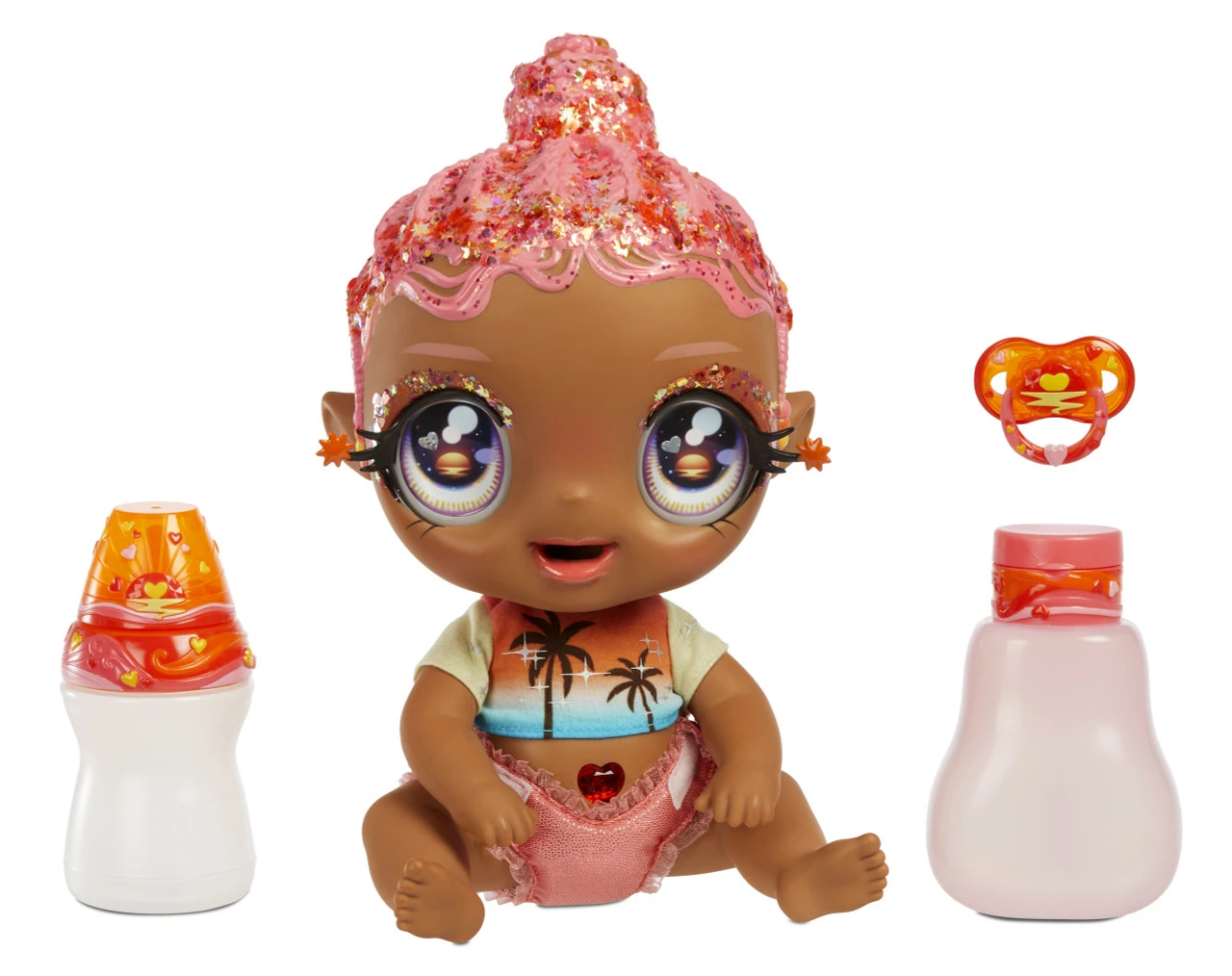 - BEAUTIFUL TROPICAL SUNSET BABY DOLL: Each baby has a unique personality expressed in their style. Solana Sunburst has a tropical sunset in her eyes, on her t-shirt, decorating her bottles and pacifier. And she has coral pink hair.
