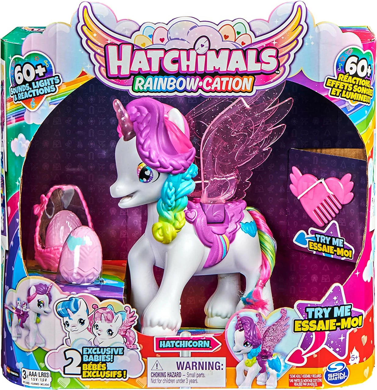 Soar through the sky with the Hatchimals CollEGGtibles Hatchicorn! This interactive Hatchimals unicorn features over 60 sounds, lights and reactions and has glittery wings that light up and really flutter! She comes with two exclusive Twin Babies, a basket and a comb to brush her soft rainbow tail. Crack into each Hatchimals egg to reveal one of three possible pairs of the most adorable unicorns! Then, sit them on Hatchicorns saddle to see how shell respond she has a unique reaction for each Baby! Lift her up to take flight on your adventure, and shell begin to flap her wings and make noises as her horn and wings change color! As you play together, Hatchicorn recognizes different flight patterns. Tilt her up to make her wings quickly flutter or tilt her down for a slow glide! As she flies, her horn and wings continue to change color. Its so much fun! Place the Babies in the basket and when the handle is in Hatchicorns mouth while shes flying or on a solid surface, youll hear happy noises as her horn and wings light up again! For even more reactions and surprises, fill the basket with the Babies or other CollEGGtibles characters (toys sold separately) and place it on her back; press her hip button while shes flying or press it while shes on the ground to hear a special song! With all of her exciting features, Hatchicorn is perfect for pretend play storytelling. Create your own adventures again and again! Hatchicorn and Hatchimals CollEGGtibles surprise toys for girls are perfect for kids who enjoy cute collectibles, action figures, dolls, and small toys. They make great birthday gifts for kids, Christmas gifts, stocking stuffers, Easter basket stuffers and more! Includes 3 AAA batteries. Experience magical adventures with the interactive Hatchimals CollEGGtibles Hatchicorn! INTERACTIVE TOY UNICORN: Adventure through the sky! Hatchicorn has over 60 lights and sounds, flapping glittery wings, a rainbow tail you can brush with her comb, 2 exclusive Twin Babies and a basket they can ride in! INTERACTIVE TOY UNICORN: Adventure through the sky! Hatchicorn has over 60 lights and sounds, flapping glittery wings, a rainbow tail you can brush with her comb, 2 exclusive Twin Babies and a basket they can ride in! OVER 60 LIGHTS, SOUNDS, REACTIONS: She flaps her wings when you lift her, knows when the basket is in her mouth, reacts to her Babies and so much more! Press her hip for a song when shes not flying! UNIQUE FLIGHT PATTERNS: Hatchicorn recognizes flight patterns! Tilt her up for a fast flutter of her wings and tilt her down for a slow glide through the air. Her horn and wings change colors! Batteries included. BASKET OR SADDLE PLAY: Place the Babies in the basket and put it in her mouth, place it on her back or fill it with other characters! Sit each Baby on her saddle to discover reactions for each unicorn! SURPRISE TOYS FOR 5 YEAR OLD GIRLS AND UP: Hatchimals toys & games, toy figures & playsets, flying toys, dolls & accessories are the perfect gifts for 5 year old girls and up. Collect them all!