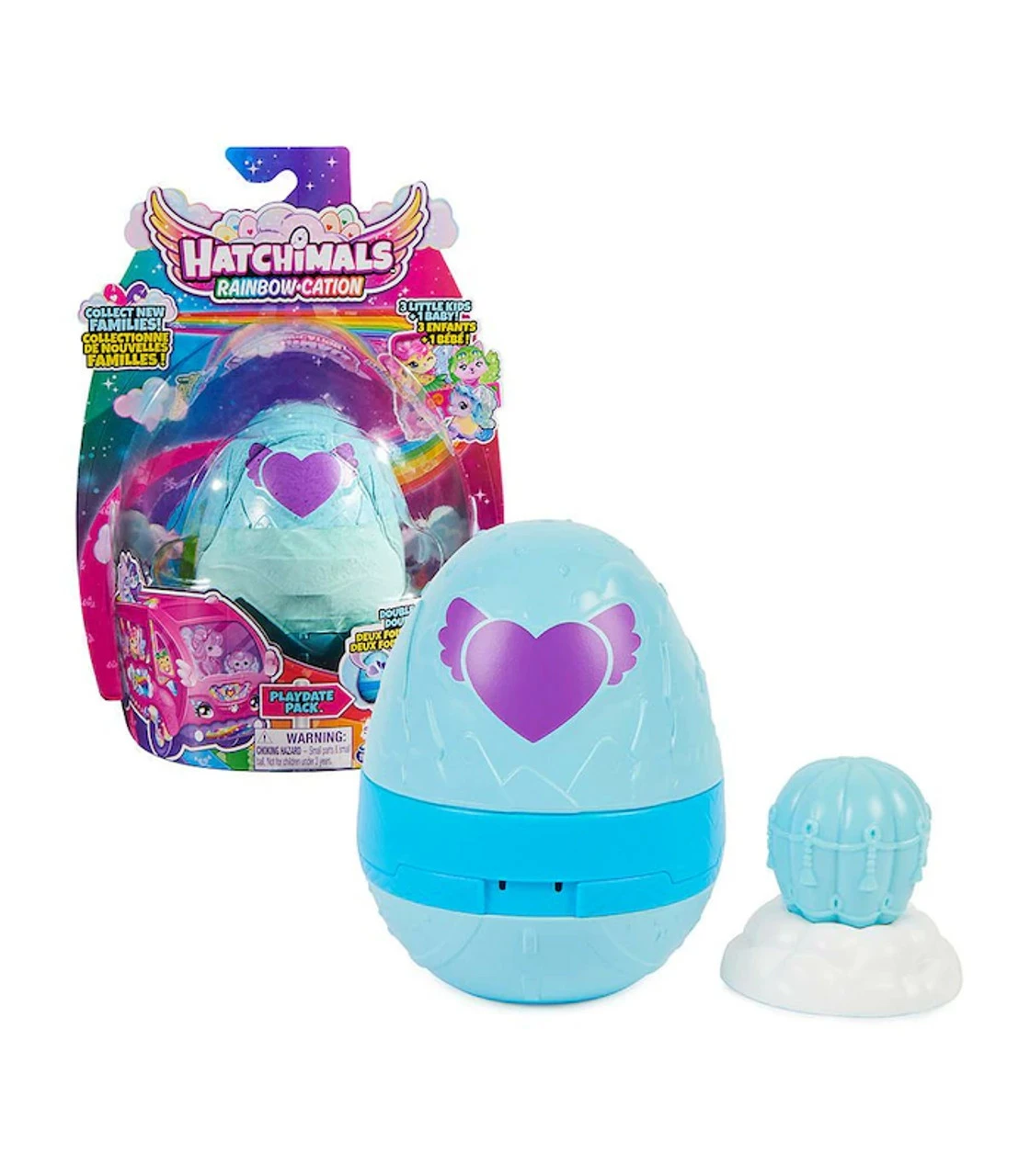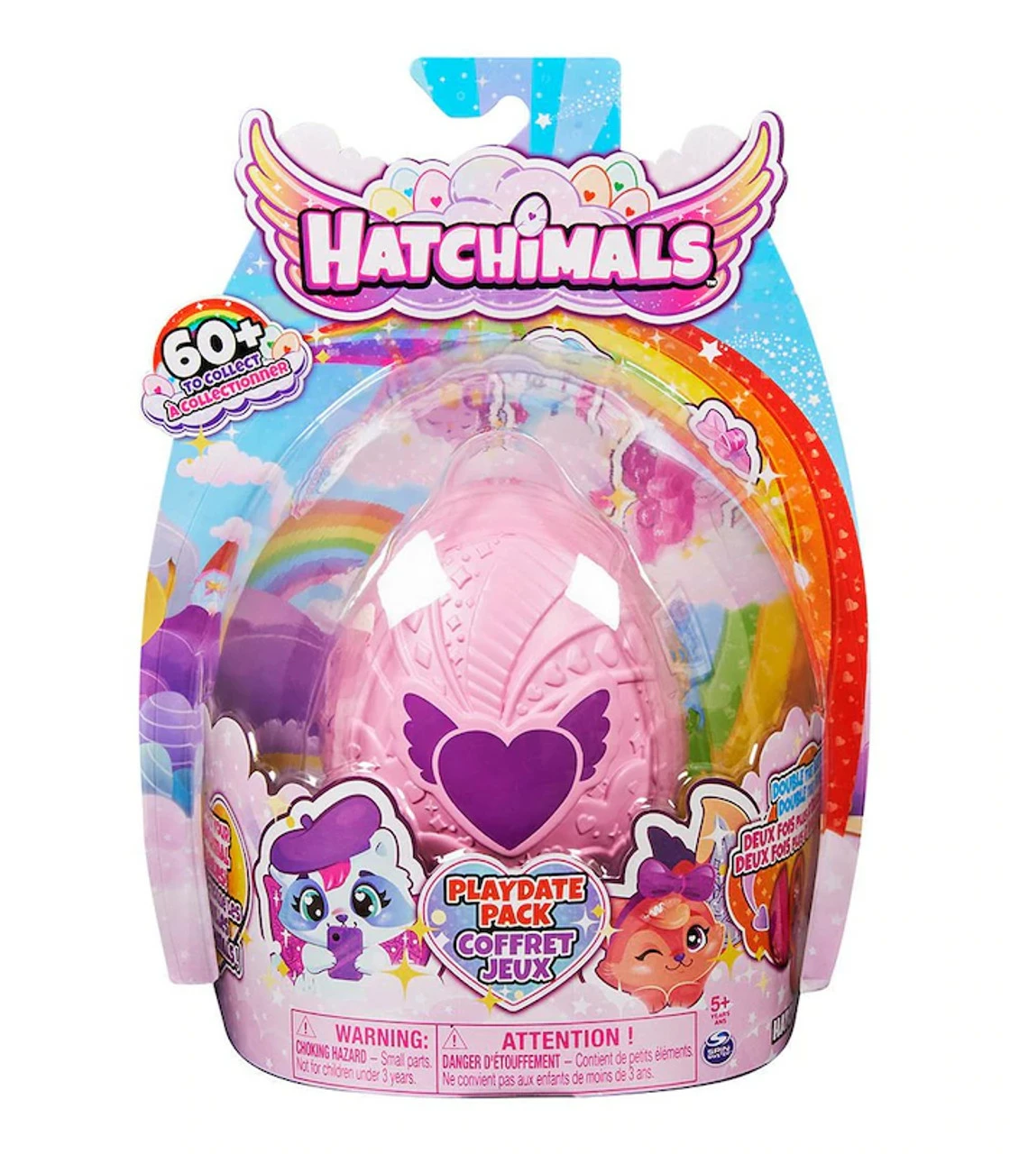 Experience vacation playdate fun with Hatchimals CollEGGtibles and the Playdate Pack! Each Rainbow-cation Hatchimals Family has their own unique look and theme inspired by their favourite vacation activities. Discover nine new families, including the Wolf Bikers, Koala Campers, Llama Florists, Luau Leopards, Sparkling Poodles, Cat Dancers, Dog Pilots, rare Ice Skating Penguins and super rare Unicorn Hair Stylists – they’re all so cute! Every Playdate Pack features an egg with a top and bottom hatch, three Little Kids, one Baby, two accessories and graphics for your playdate scene. The surprise eggs in the Playdate Packs come with four different Hatchimals friends inside – two siblings from one family, and two from another family! Crack the top of the Hatchimals egg to find two Little Kids and an accessory, then crack the bottom to find one more Little Kid and the Baby! After discovering your pack’s adorable characters, open the centre of the egg to reveal your surprise Rainbow-cation scene! You could find a camping vacation, hot air balloon vacation, snow vacation, water park vacation and more! Inside the packaging is the other accessory piece and the graphics to add to your scene. The unique playset and the Hatchimals and accessories are perfect for your pretend play vacation adventures! With over 60 new Rainbow-cation Hatchimals and 10 Playdate Packs to collect (toys each sold separately), complete all nine Hatchimals Families! Hatchimals CollEGGtibles surprise toys for girls are perfect for kids who enjoy cute collectibles, action figures, dolls, and small toys. They make great birthday gifts for kids, Christmas gifts, stocking stuffers, Easter basket stuffers and more! Bring home endless vacation playdate fun with the Hatchimals CollEGGtibles Playdate Pack! Features: 9 HATCHIMALS FAMILIES: Collect 9 new families, including Wolf Bikers, Koala Campers, Llama Florists, Luau Leopards, Sparkling Poodles, rare Ice Skating Penguins, super rare Unicorn Hair Stylists and more!