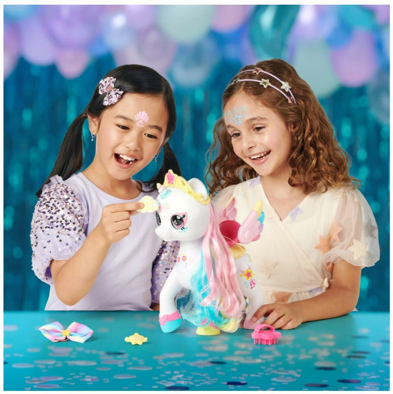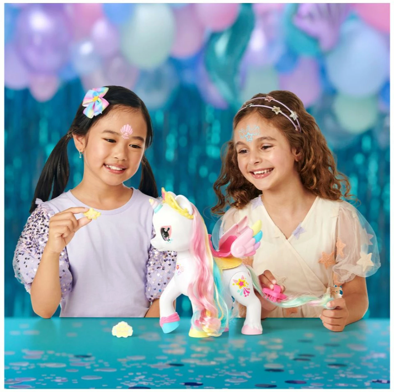 Turn the Unicorn’s Rainbow Horn to open her Secret Saddle. Inside are so many accessories! Use her Star Brush to brush your unicorn’s rainbow mane and tail. Style her mane with her hair clip and hair bow. Maybe you will find a Limited Edition hair bow! Also hidden inside is a magical Shopkin Unicorn Star sponge. When you dip her Shopkin into ice-cold water and wipe it across your Unicorn’s forehead, it reveals her beautiful face paint!