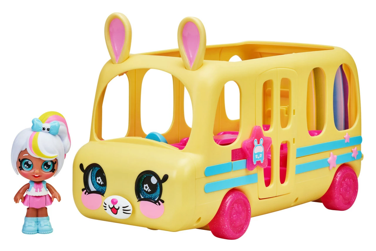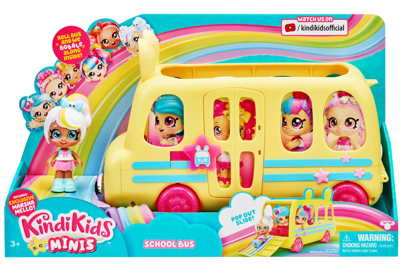 Hop on board the Kindi Kids Minis School Bus with Marsha Mello. This bus will hold seven Kindi Kids Minis. Pop them into their seats. As the bus rolls along watch their heads bobble and bounce about! This adorable Bus is full of fun features including opening doors and pull-down slide!