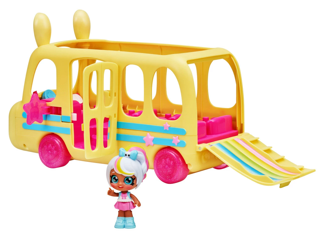 • Open up the back of the bus to reveal a fun Rainbow Slide for the Kindi Kids Minis to slide down!