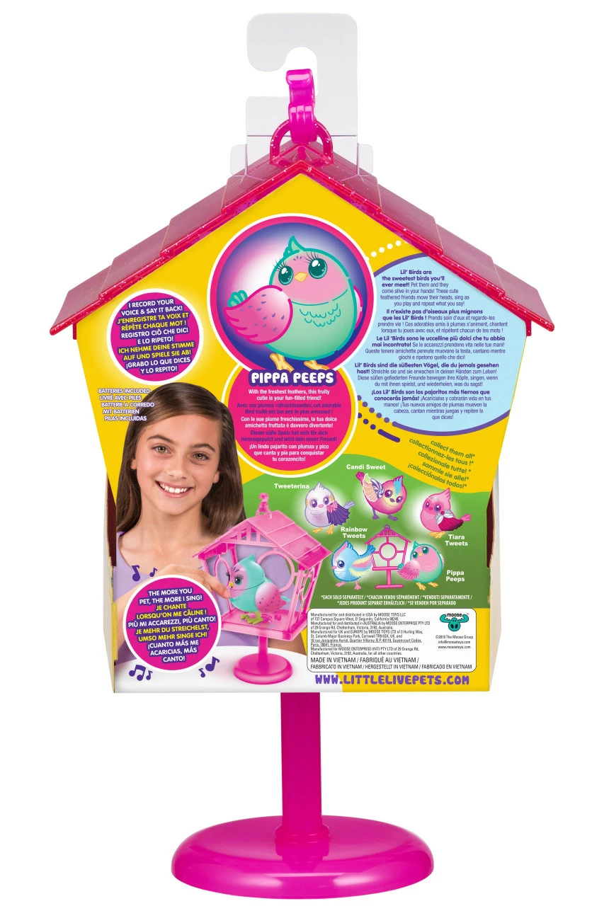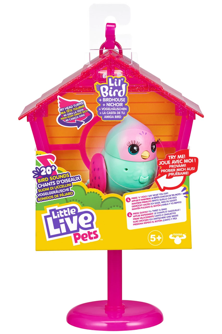Little Live Pets – Lil’ Birds are the sweetest birds you’ll ever meet! These adorable little round birds with big, beautiful eyes come to life in your hands as you pet and interact with them. Gently stroke your Lil’ Bird’s back and it will tweet and turn its head for you! They really react to your touch! The more you pet, the happier your Lil’ Bird will get! They will chirp and tweet for longer and eventually whistle a tune for you! Lil’ Birds love to chat and repeat what you say! Press the Lil’ Bird’s talk button on its chest and say your message. Your Lil’ Bird will move its beak and turn its head while immediately repeating your message back to you! These colorful toy birds will brighten your day with over 20 bird sounds to sing! This Lil’ Bird lives in its own adorable Bird House! The Bird House can sit on its stand or hang from its hook. You can even link different Bird Houses together to make an amazing linkable hanging display for your Lil’ Birds to play and live in! Each Lil’ Bird has decorations and features on their wings and faces that relate to a certain theme. Collect them all to form your own fabulous flock!