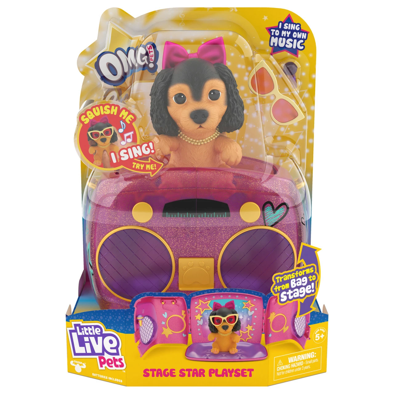 It’s official! OMG! Pets Have Talent! Super soft, squishy and born to perform, these new OMG Pets love to sing! And now you can take your pup on tour in their own “Stage Star Bag”! Carry your pet with you in this super cute boom box bag. When it’s time to sing, open up the sides of the bag and watch it transform into an amazing stage for your puppy to perform on! Put on a show wherever you go! Squeeze this adorable “Pop Queen” puppy and hear her tunefully howl! This Little Live Pet can sing to her own music. Place her on “Music Mode” and press her belly. She can sing along to her three different musical tracks with long and short notes depending on how you squeeze them! She can even change her pitch as you squeeze this cute pup’s belly! Place your pup on “Singing Mode”, squeeze her belly and she will sing “a cappella” without any music. It’s so much fun to hear her sing along to your favorite tunes. This adorable “Pop Queen” is dressed to impress with her beautiful bow and cool sunglasses! She even has her own microphone! This puppy is so interactive and tactile and full of fun sounds and personality! These talented pets can’t wait to show you what they’ve got! Each pet comes with their own Birth Certificate for you to fill in and make them your own. Collect all of the new OMG! Pets and create your very own “Pup Star” Band!