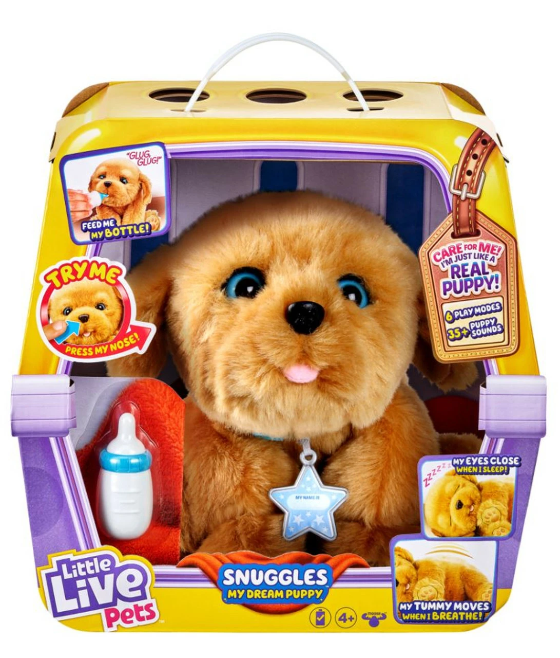 Snuggles My Dream Puppy is the no mess toy pup who loves to be loved! Snuggles moves and feels just like a real puppy. Hold them in your arms and give them a hug. You wont be able to resist Snuggle’s big blue expressive eyes.