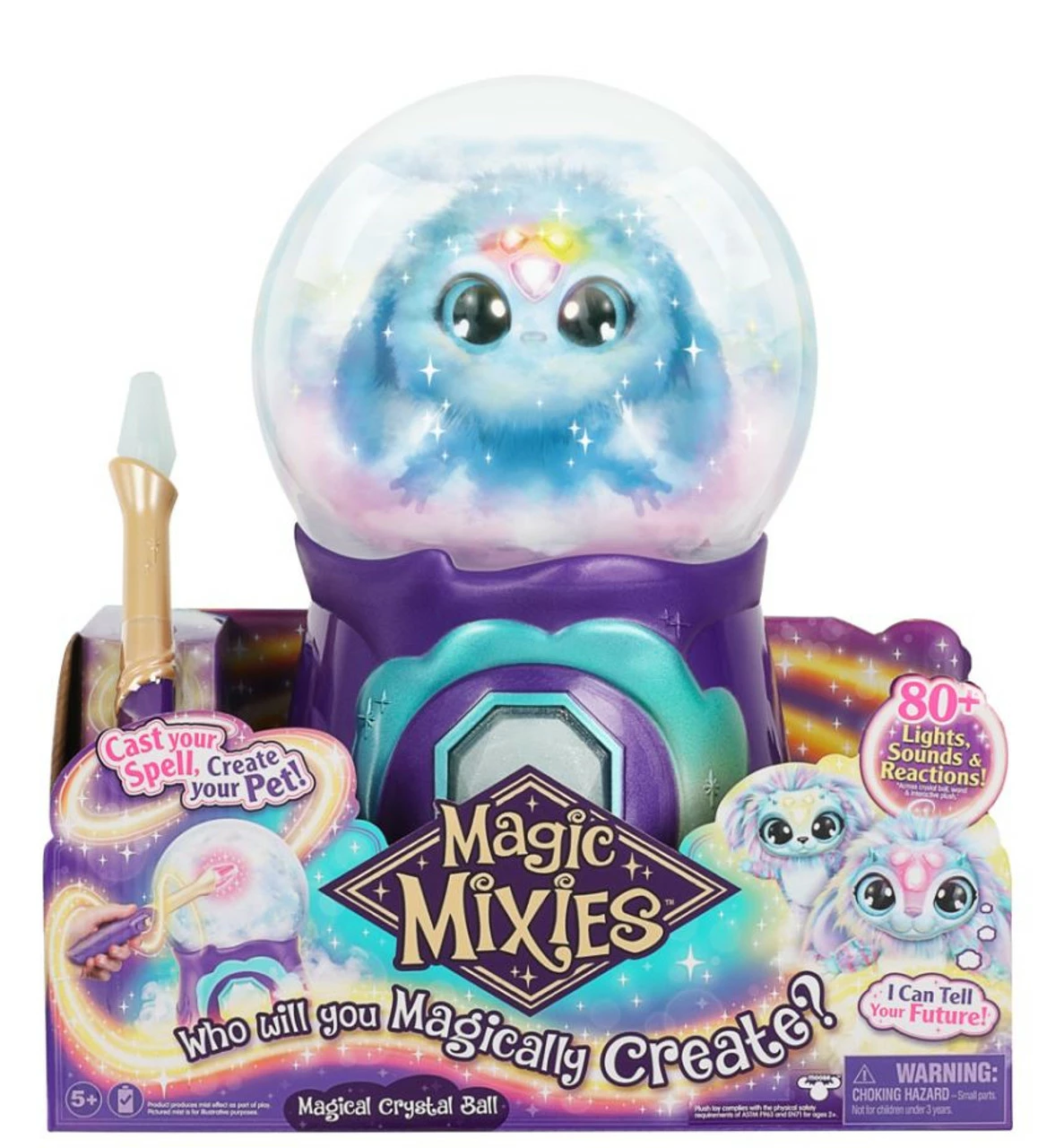 Remove the top of the Crystal Ball to release your cute new interactive plush toy pet! With the magic and fun only just beginning, use your magic wand to interact with your Magic Mixie by performing spells, playing a game together and having your fortune told! You can reset your Magical Crystal Ball to perform the mist-filled reveal again and again using your Magic Mixie or other items!