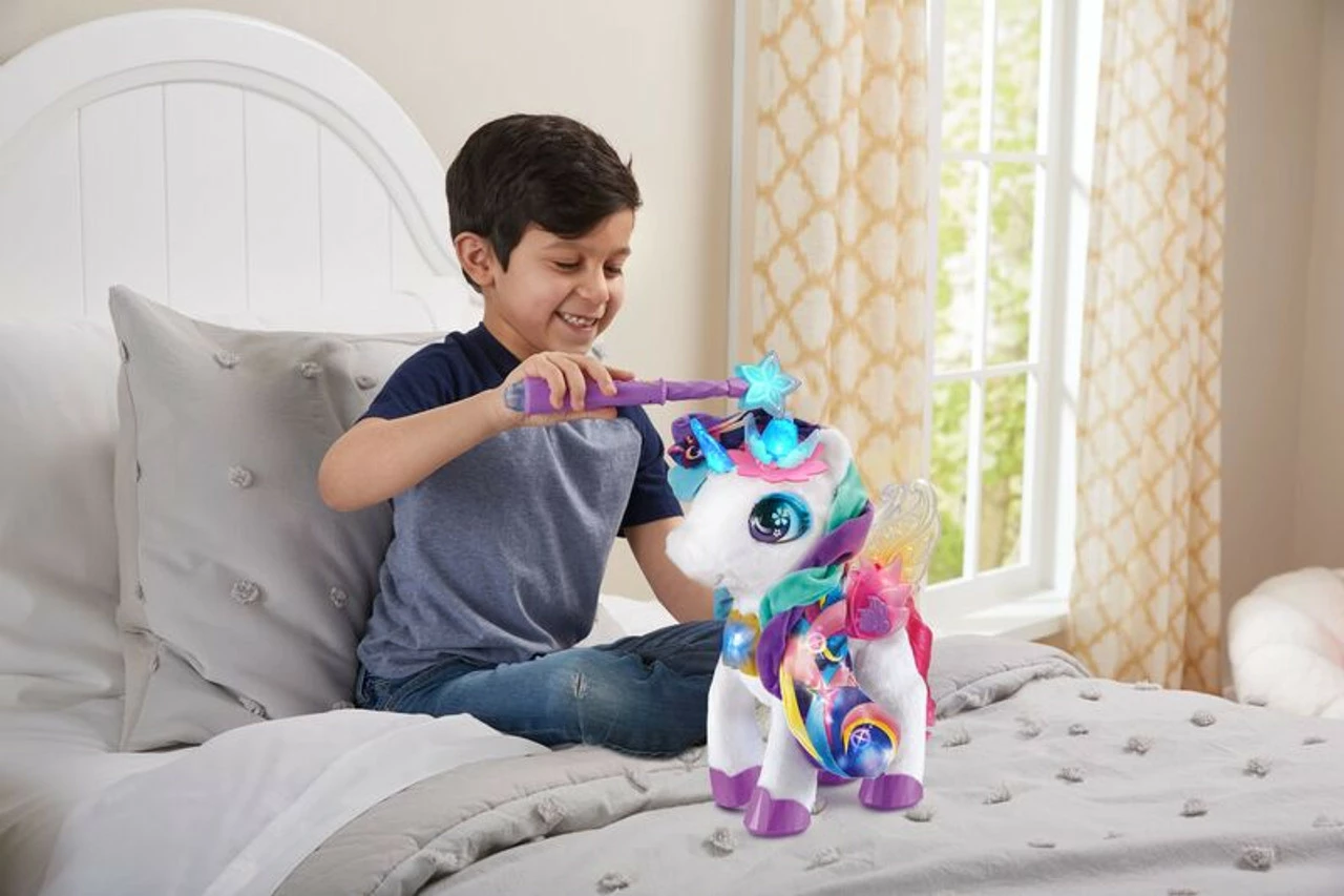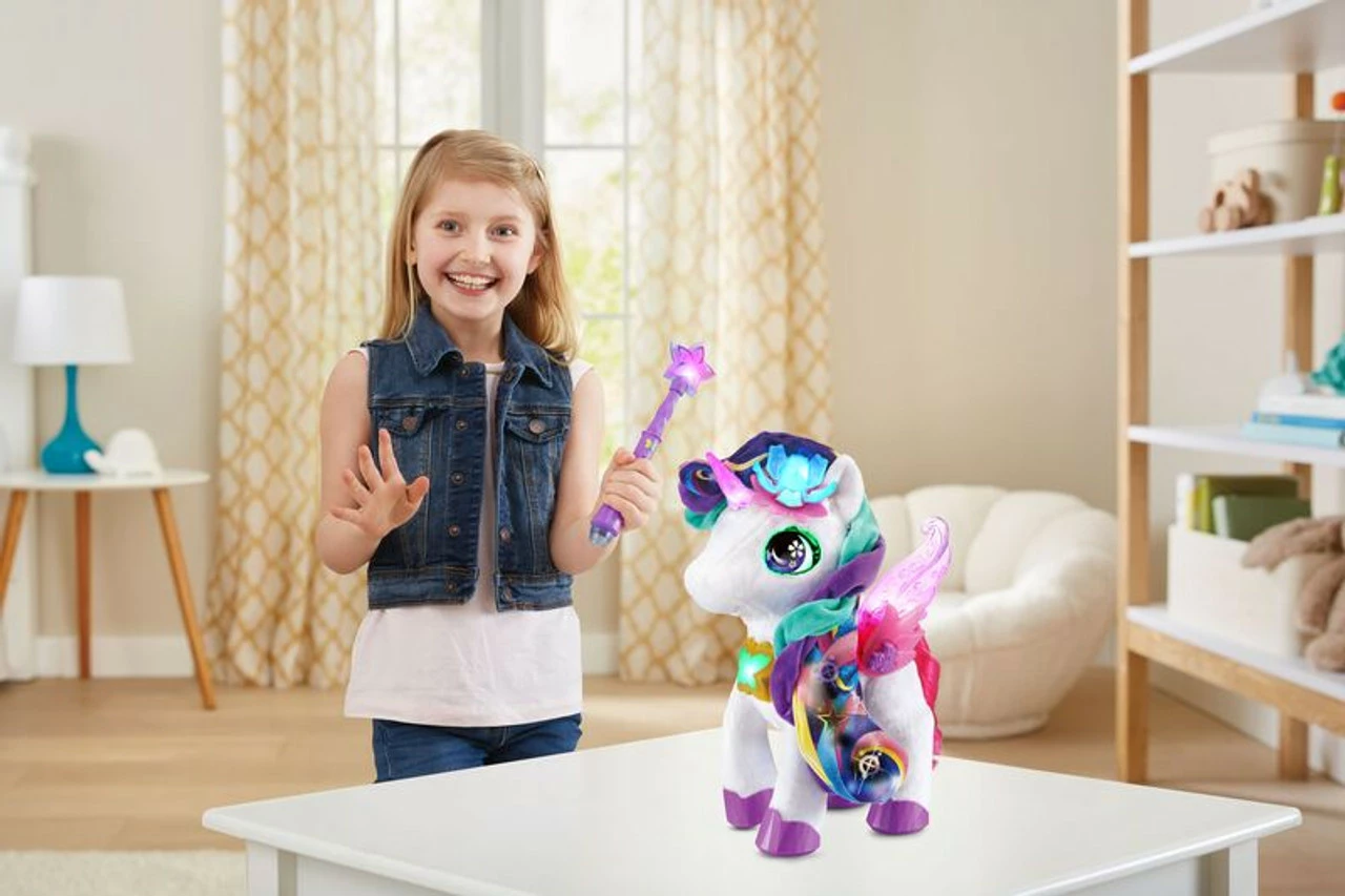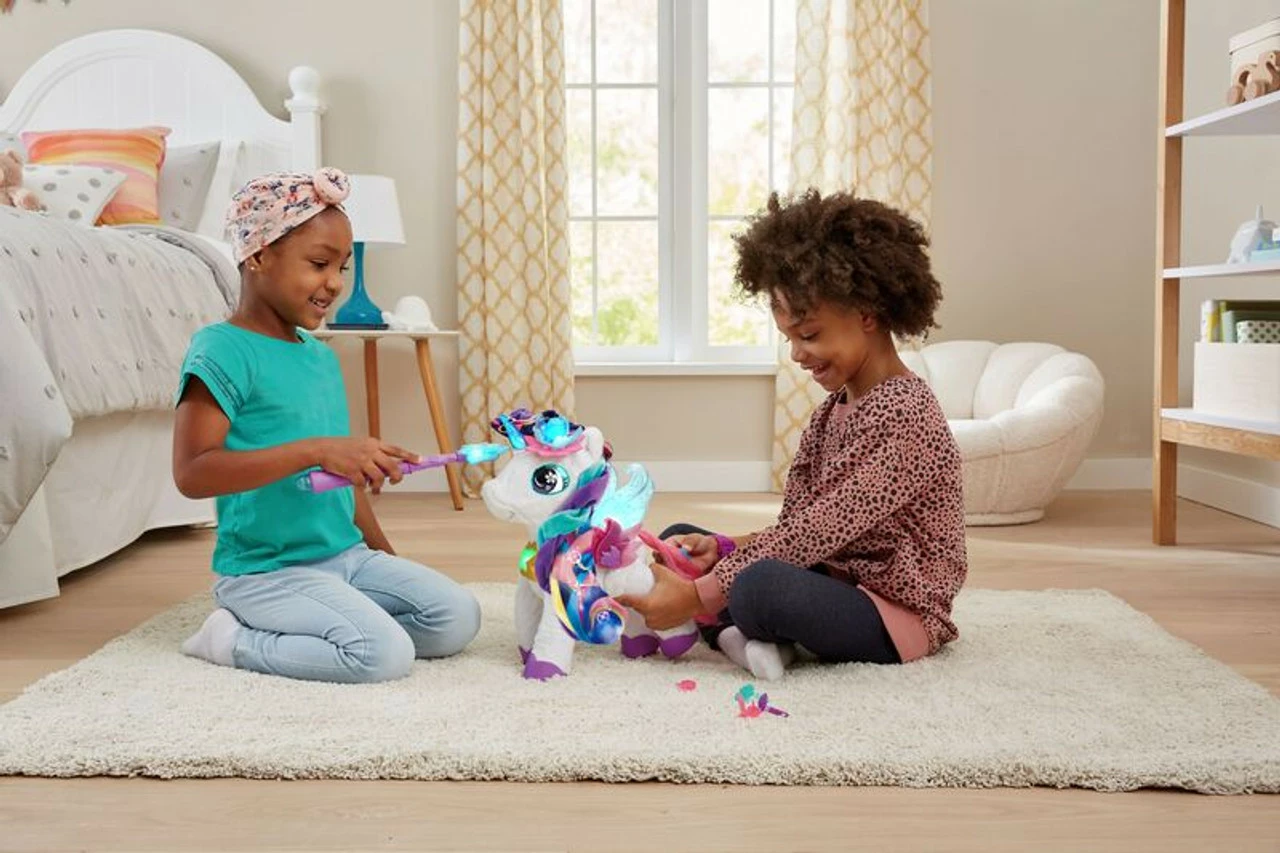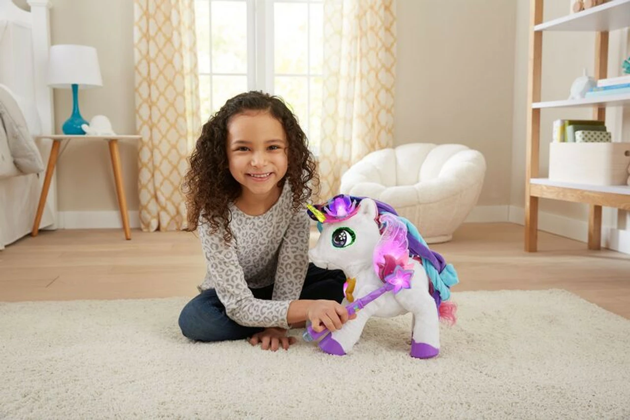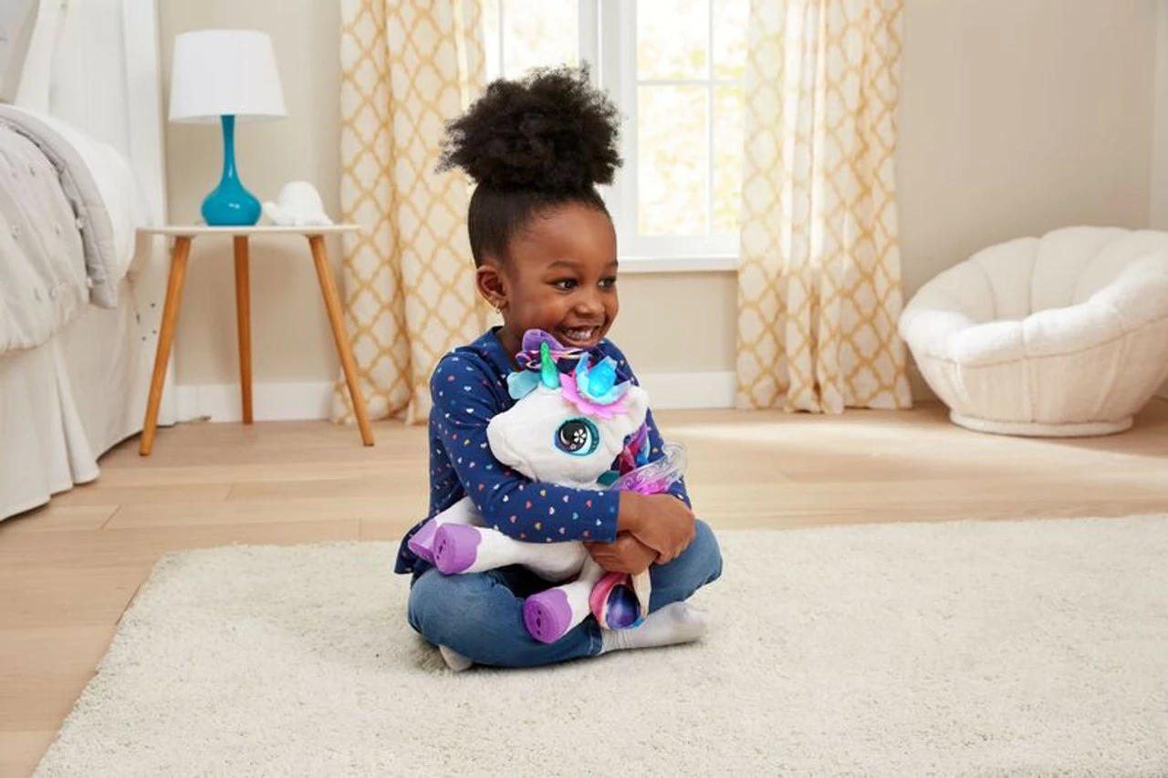 Play music for Myla and watch her dance; ask her to play a song, then sing along to eight tunes. Brush her tail with the comb and accessorise Myla using six hair clips you can share.