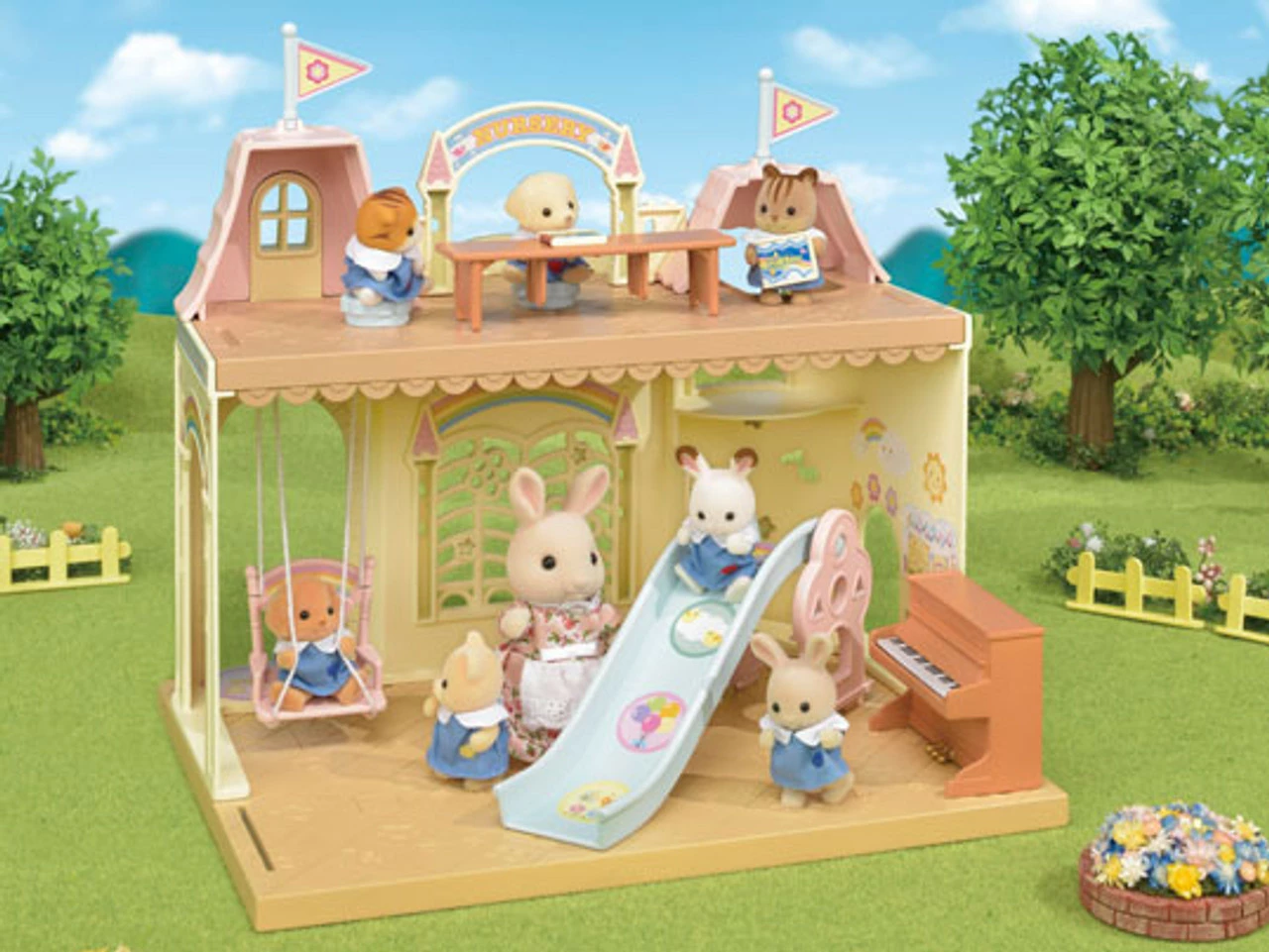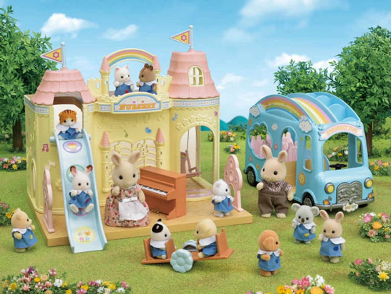 Baby Castle Nursery is a nursery school with plenty of playtime for babies to attend. Change the direction of the building to change the size of the room and front garden. Attach the slide from this set to Sunshine Nursery Bus and have fun sliding from the second floor of the nursery school into the pool. Place Baby Castle Playground on the second floor to create a large, castle-like nursery school. Stimulates imaginative role-playing for children. *Suitable for ages three years and above. Get all you need to play in this great value set, featuring everything from the Baby Castle Nursery, Sunshine Nursery Bus and Baby Castle Playground sets, along with Milk Rabbit mother and Toy Poodle baby, both in special outfits. Baby Castle Nursery is a nursery school with plenty of playtime for babies to attend. Change the direction of the building to change the size of the room and front garden. Attach the slide from this set to Sunshine Nursery Bus and have fun sliding from the second floor of the nursery school into the pool. Place Baby Castle Playground on the second floor to create a large, castle-like nursery school. Stimulates imaginative role-playing for children. Suitable for ages three years and above. Contents: Kate Milk Rabbit, Milo Toy Poodle, Baby Castle Nursery, Floor, Rainbow arch, 2 railings, 2 flags, Slide, Piano, Table/seesaw, 2 chairs, 2 picture books, Swing, String to attach swing, Sunshine Nursery Bus, Lower deck seating (front), Lower deck seating (middle), Lower deck seating (rear), Upper deck seating (stairs), Upper deck seating (slide), Baby Castle Playground (Roof), Baby castle playground (main unit), Flag, Spinning wall art, Ladder, Floor