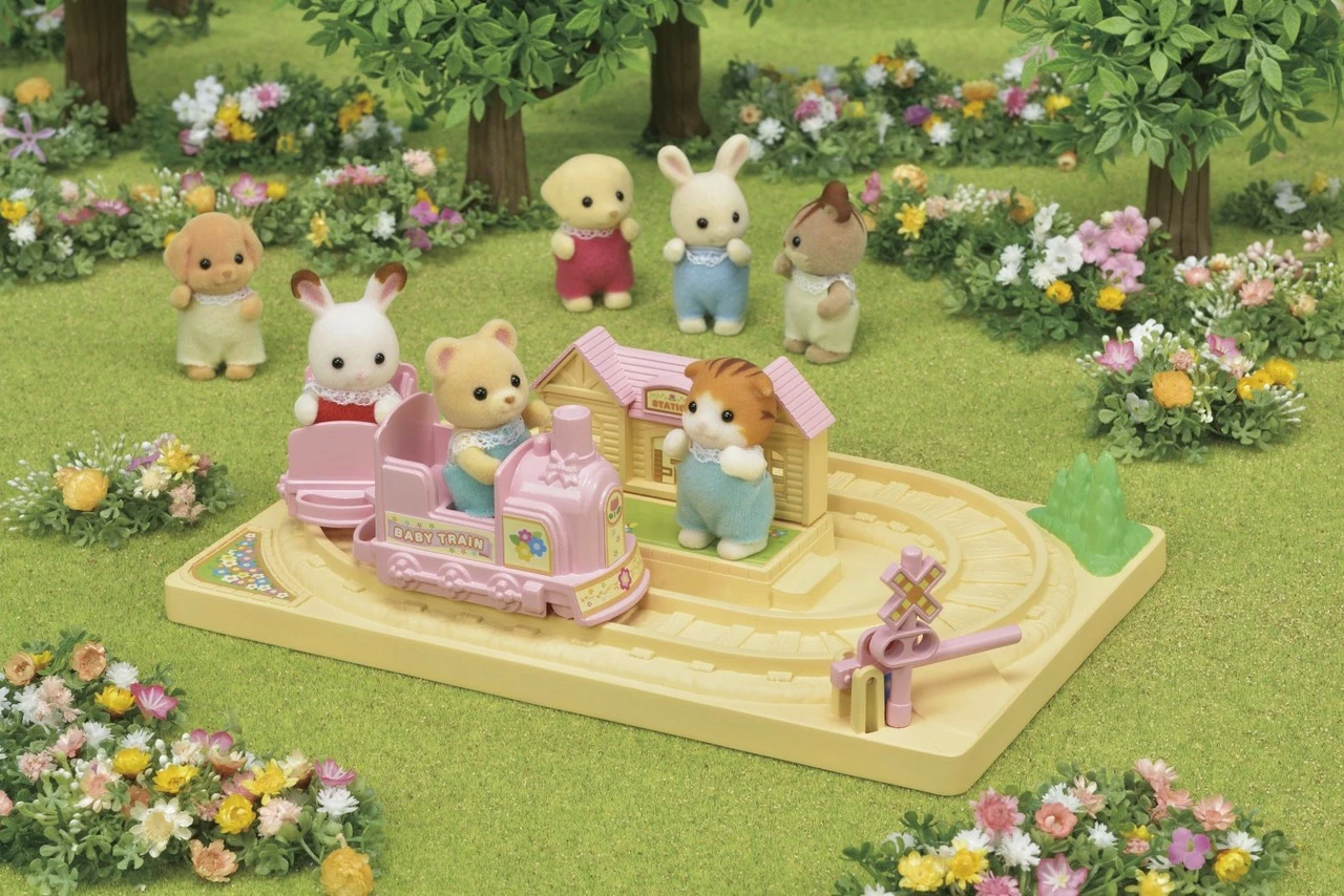 A playground with moveable train for little ones to enjoy. It includes a moveable railroad crossing gate and Jason Petite Bear Baby figure. This fun train set can move along the train tracks with a gentle push, but don’t forget to stop at the railroad crossing gate.