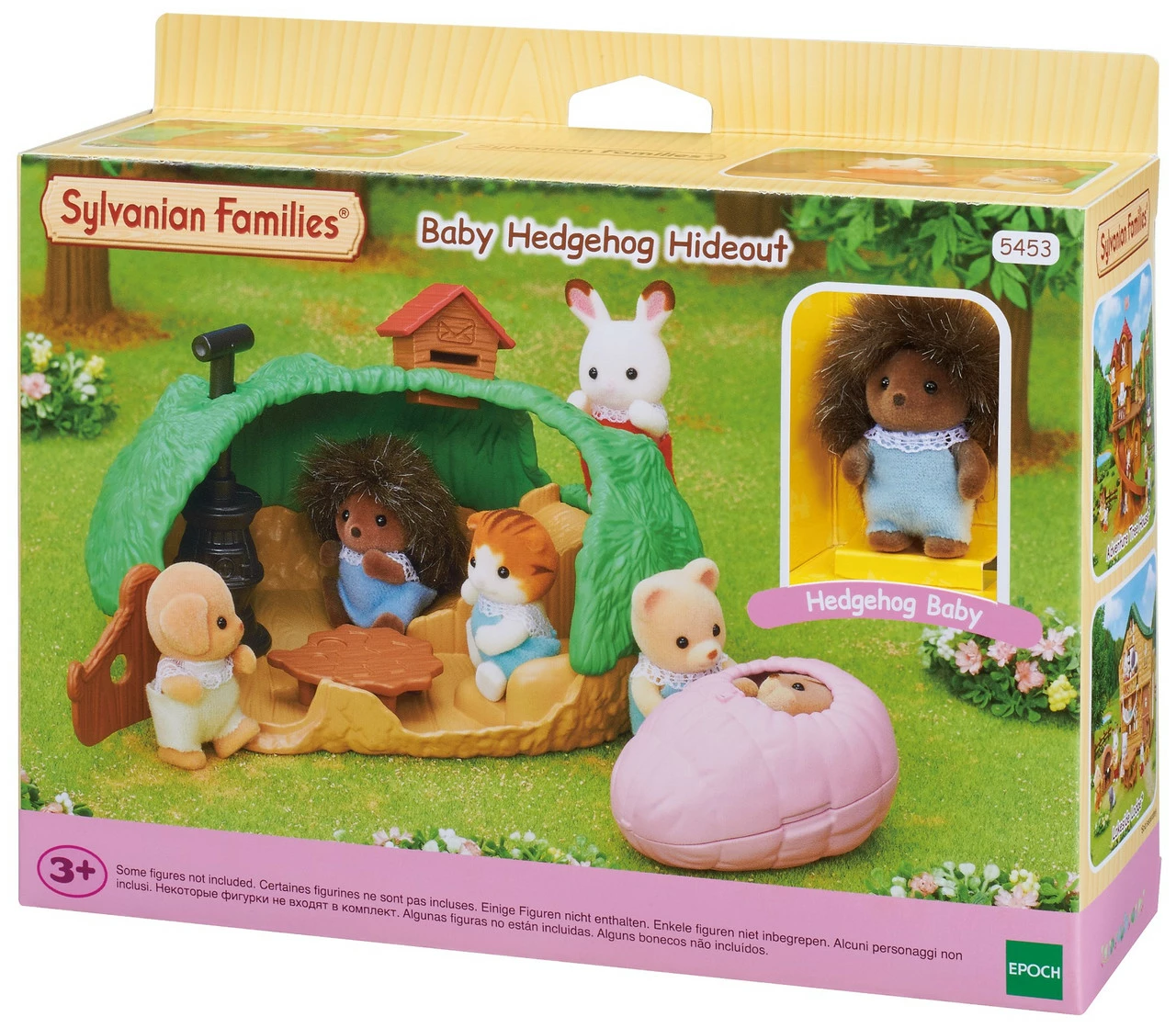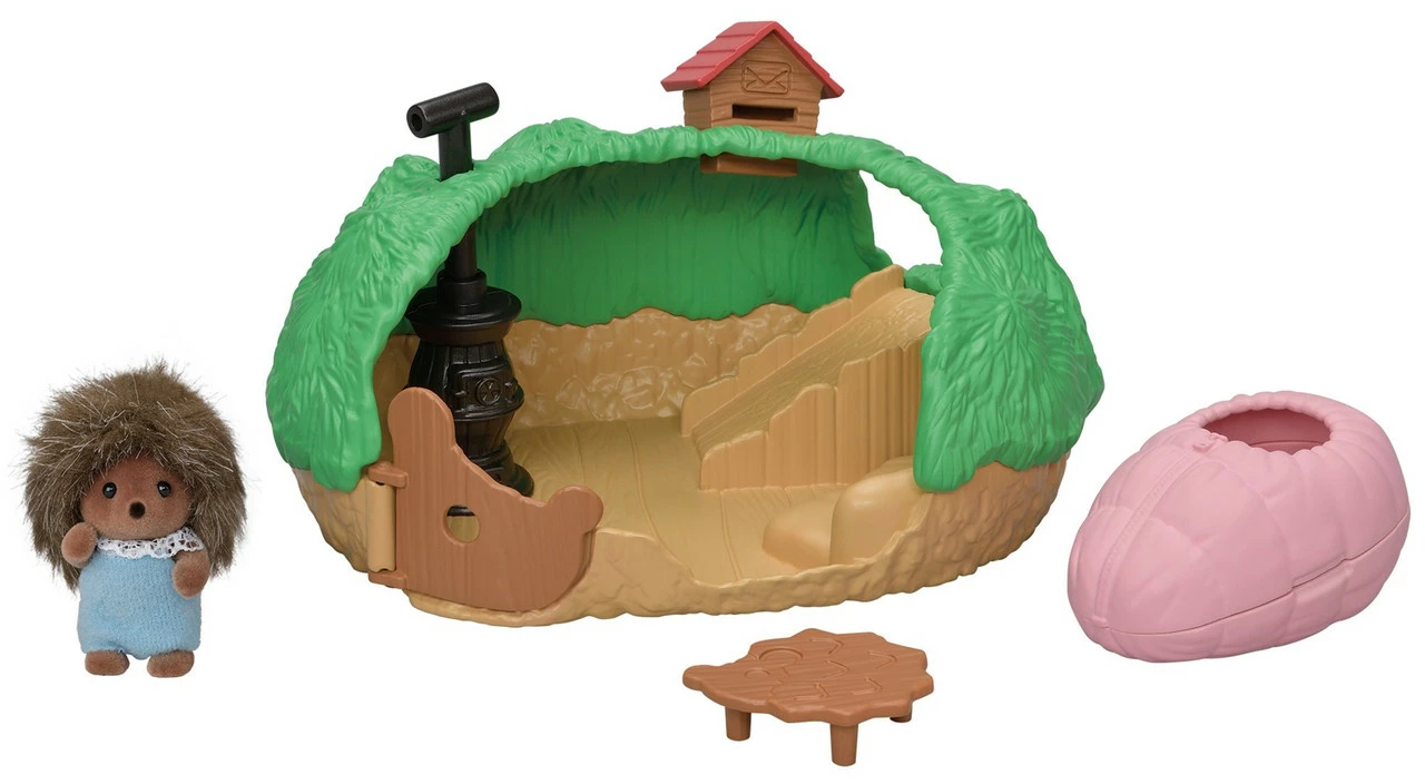 The Baby Hedgehog Hideout is a secret hedgehog motif house for a Hedgehog Baby. The Hedgehog Baby fits snugly into the sleeping bag. Inside the hideout is a slide, a hedgehog-shaped table, and a stove.