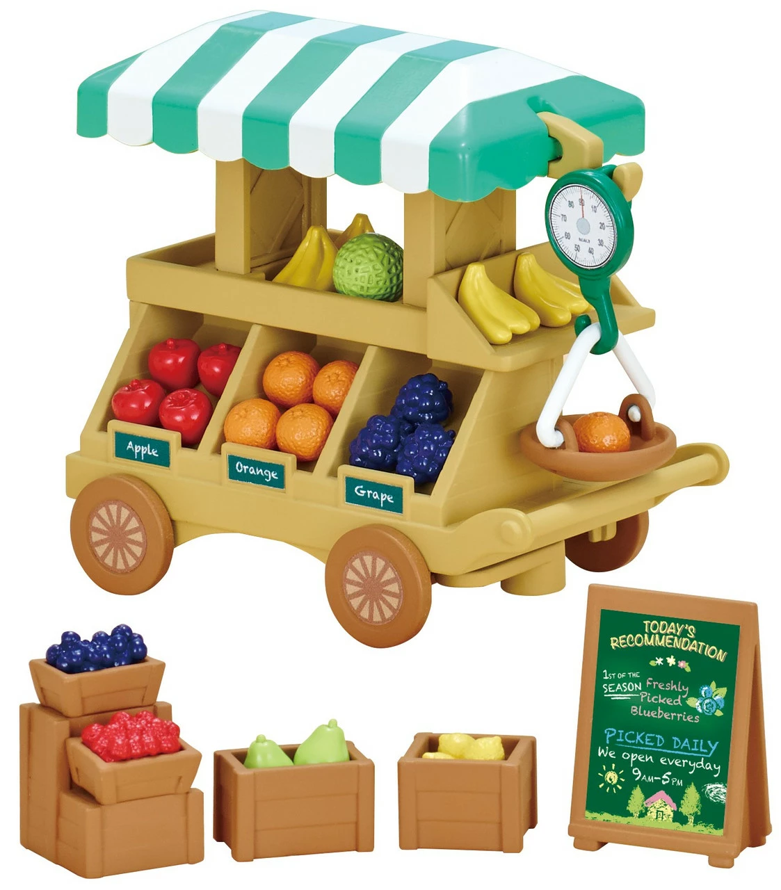 Set includes scale, scale basket, sign, bunch of bananas, apples, oranges, lemon, pear, melon, bunch of raspberries, bunch of blueberries plus more accessories.