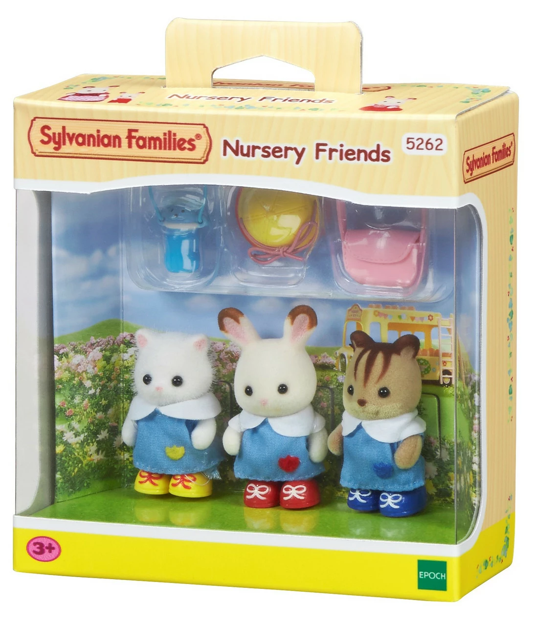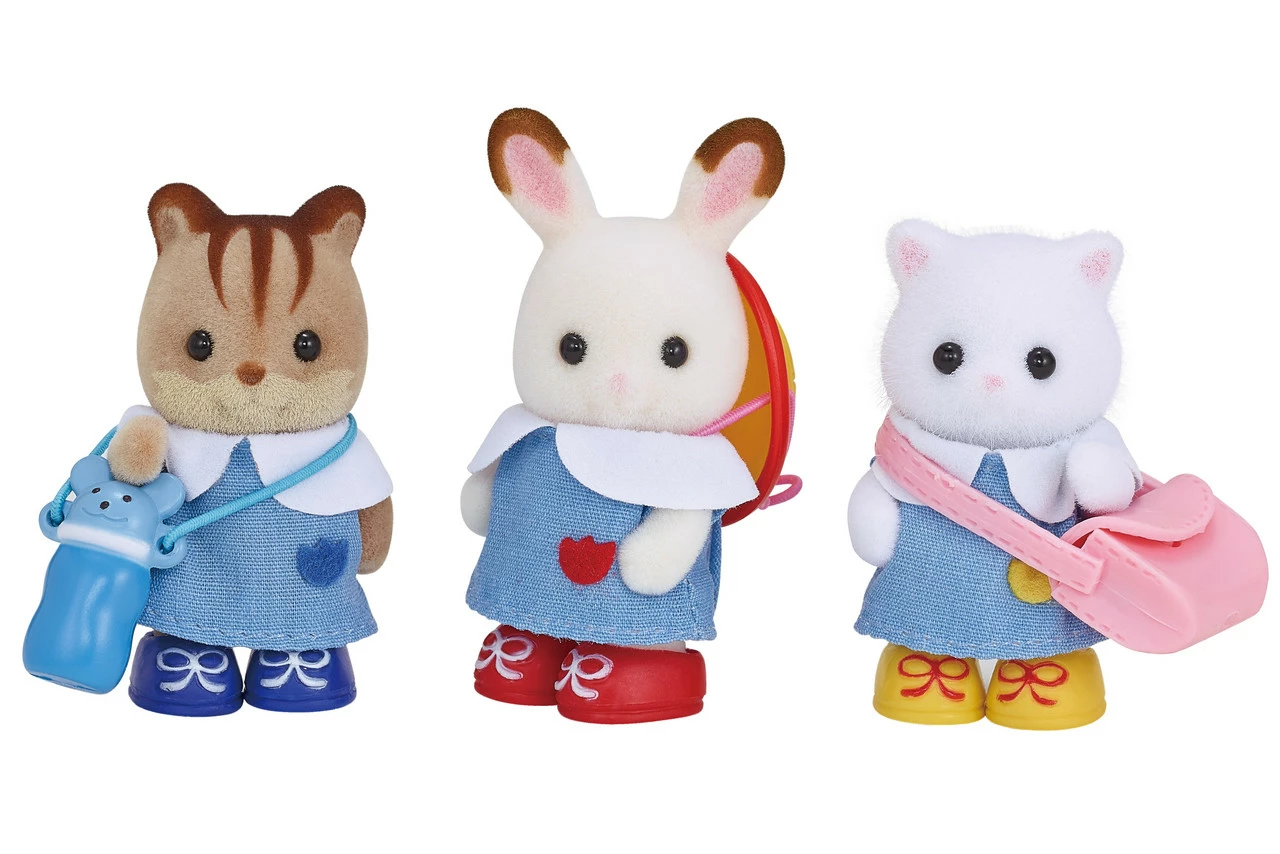 The Nursery Friends Set come with baby figures wearing nursery school clothes with different coloured emblems and adorable nursery goods. Each baby wears shoes in the same colour as the emblem on their nursery clothes.